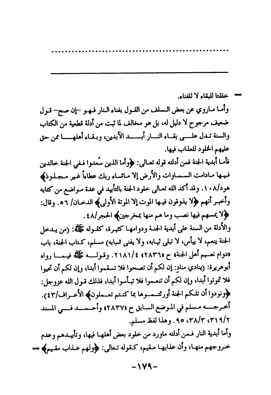 وأما ما روي عن بعض السلف من القول بفناء النار فهو ـ إن صح ـ قول ضعيف مرجوح لا دليل له، بل هو مخالف لما ثبت من أدلة قطعية من الكتاب والسنة تدل على بقاء النار أبد الآبدين، وبقاء أهلها ممن حق عليهم الخلود للعذاب فيها.