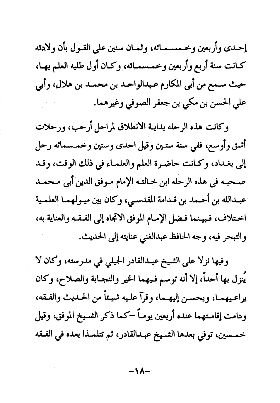 وفيها نزلا على الشيخ عبد القادر الجيلي في مدرسته، وكان لا ينزل بها أحداً، إلا أنه توسم فيهما الخير والنجابة والصلاح، وكان يراعيهما، ويحسن إليهما، وقرآ عليه شيئاً من الحديث والفقه، ودامت إقامتهما عنده أربعين يوماً ـ كما ذكر الشيخ الموفق، وقيل خمسين، توفي بعدها الشيخ عبد القادر، ثم تتلمذا بعده في الفقه