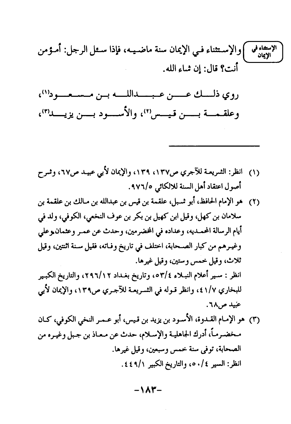 والإستثناء في الإيمان سنة ماضية، فإذا سئل الرجل: أمؤمن أنت؟ قال: إن شاء الله.