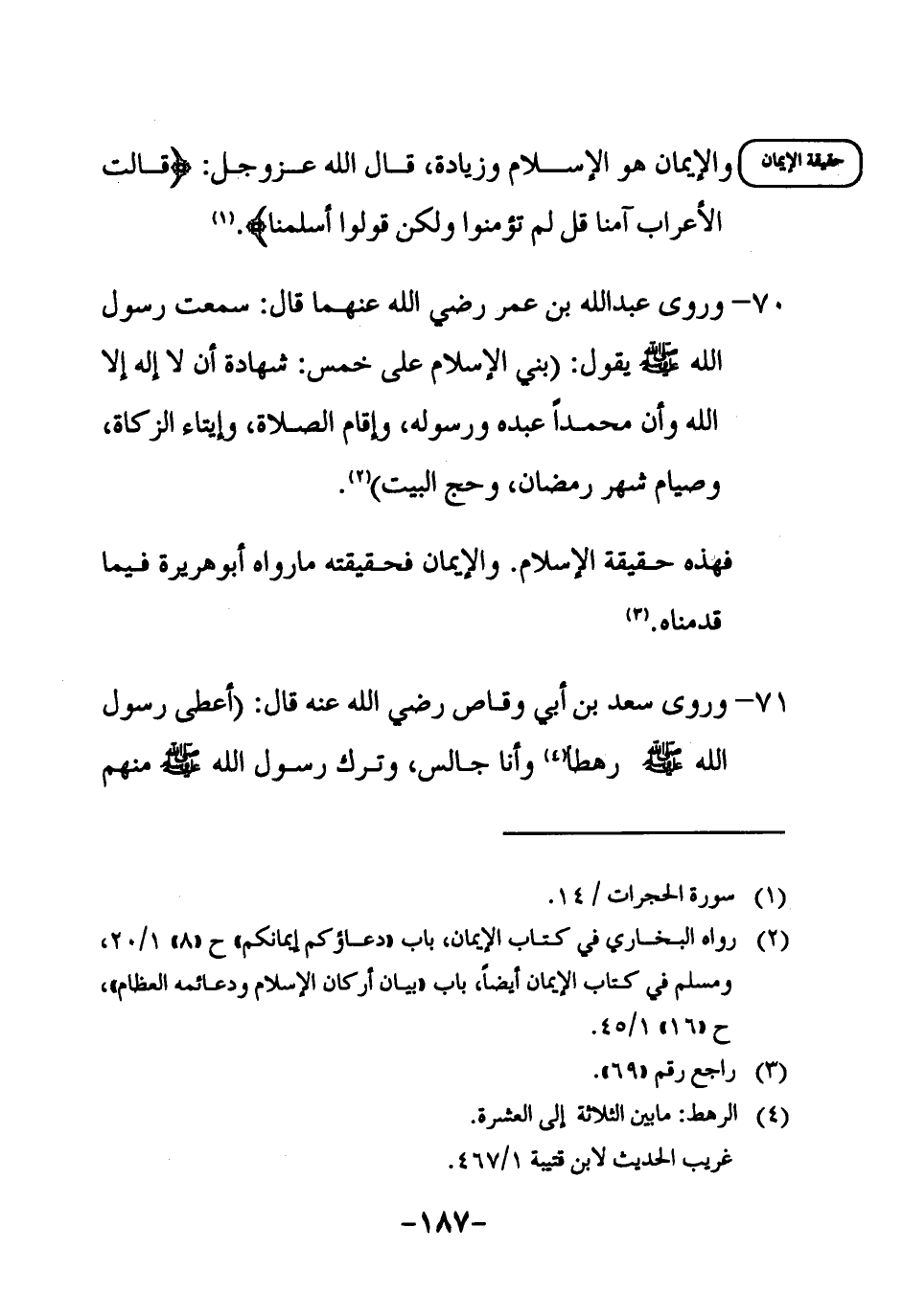 والإيمان هو الإسلام وزيادة قال الله تعالى: {قَالَتِ الأَعْرَابُ آمَنَّا قُلْ لَمْ تُؤْمِنُوا وَلَكِنْ قُولُوا أَسْلَمْنَا} 1.