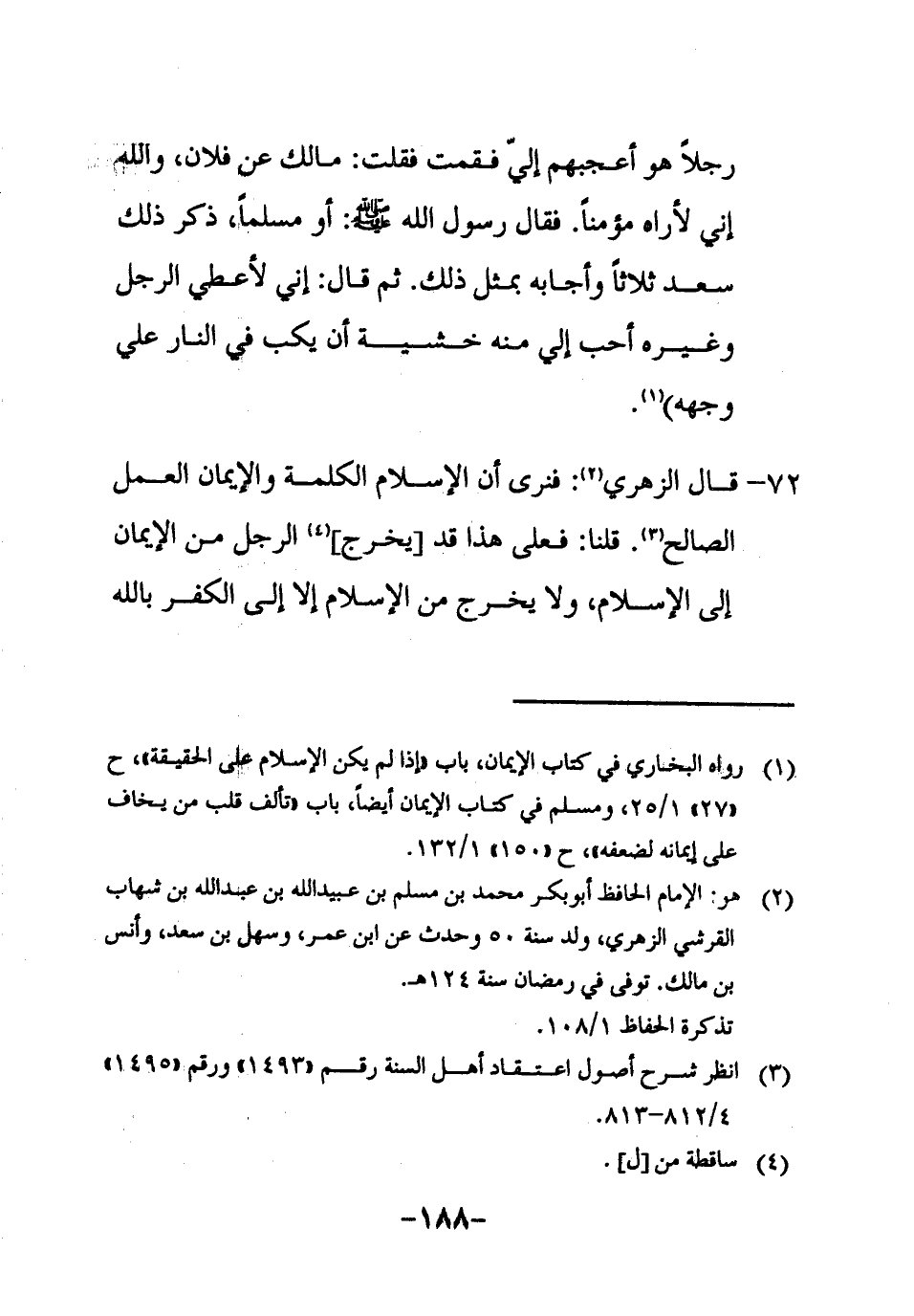72 ـ قال الزهري2: فنرى أن الإسلام الكلمة والإيمان العمل الصالح3. قلنا: فعلى هذا قد [يخرج] 4 الرجل من الإيمان إلى الإسلام، ولا يخرج من الإسلام إلا إلى الكفر بالله