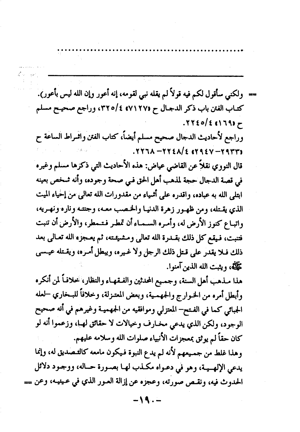 قال النووي نقلاً عن القاضي عياض: هذه الأحاديث التي ذكرها مسلم وغيره في قصة الدجال حجة لمذهب أهل الحق في صحة وجوده، وأنه شخص بعينه ابتلى الله به عباده، وأقدره على أشياء من مقدورات الله تعالى من إحياء الميت الذي يقلته، ومن ظهور زهرة الدنيا والخصب معه، وجنته وناره ونهريه، واتباع كنوز الأرض له، وأمره السماء أن تمطر فتمطر، والأرض أن تنبت فتنبت، فيقع كل ذلك بقدرة الله تعالى ومشيئته، ثم يعجزه الله تعالى بعد ذلك فلا يقدر على قتل ذلك الرجل ولا غيره، ويبطل أمره، ويقتله عيسى صلى الله عليه وسلم، ويثبت الله الذين آمنوا.