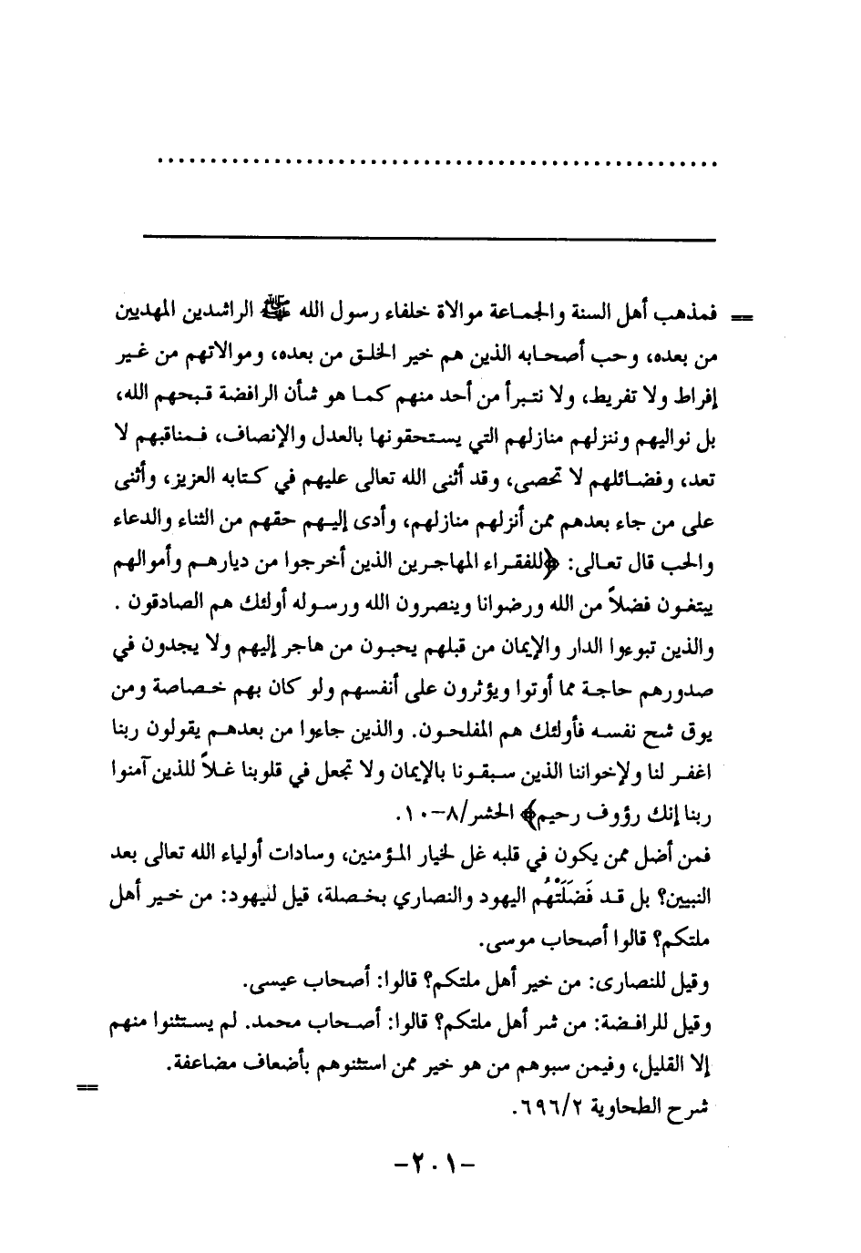 فمذهب أهل السنة والجماعة موالاة خلفاء رسول الله صلى الله عليه وسلم الراشدين المهديين من بعده، وحب أصحابه الذين هم خير الخلق من بعده، وموالاتهم من غير إفراط ولا تفريط، ولا نتبرأ من أحد منهم كما هو شأن الرافضة قبحهم الله، بل نواليهم وننزلهم منازلهم التي يستحقونها بالعدل والإنصاف، فمناقبهم لا تعد، وفضائلهم لا تحصى، وقد أثنى اله تعالى عليهم في كتابه العزيز، وأثنى على من جاء بعدهم ممن أنزلهم منازلهم، وأدى إليهم حقهم من الثناء والدعاء، والحب قال تعالى: {لِلْفُقَرَاءِ الْمُهَاجِرِينَ الَّذِينَ أُخْرِجُوا مِنْ دِيَارِهِمْ وَأَمْوَالِهِمْ يَبْتَغُونَ فَضْلاً مِنَ اللَّهِ وَرِضْوَاناً وَيَنْصُرُونَ اللَّهَ وَرَسُولَهُ أُولَئِكَ هُمُ الصَّادِقُونَ وَالَّذِينَ تَبَوَّأُوا الدَّارَ وَالْأِيمَانَ مِنْ قَبْلِهِمْ يُحِبُّونَ مَنْ هَاجَرَ إِلَيْهِمْ وَلا يَجِدُونَ فِي صُدُورِهِمْ حَاجَةً مِمَّا أُوتُوا وَيُؤْثِرُونَ عَلَى أَنْفُسِهِمْ وَلَوْ كَانَ بِهِمْ خَصَاصَةٌ وَمَنْ يُوقَ شُحَّ نَفْسِهِ فَأُولَئِكَ هُمُ الْمُفْلِحُونَ وَالَّذِينَ جَاءُوا مِنْ بَعْدِهِمْ يَقُولُونَ رَبَّنَا اغْفِرْ لَنَا وَلِإِخْوَانِنَا الَّذِينَ سَبَقُونَا بِالْأِيمَانِ وَلا تَجْعَلْ فِي قُلُوبِنَا غِلّاً لِلَّذِينَ آمَنُوا رَبَّنَا إِنَّكَ رَؤُوفٌ رَحِيمٌ} الحشر/8-10.
