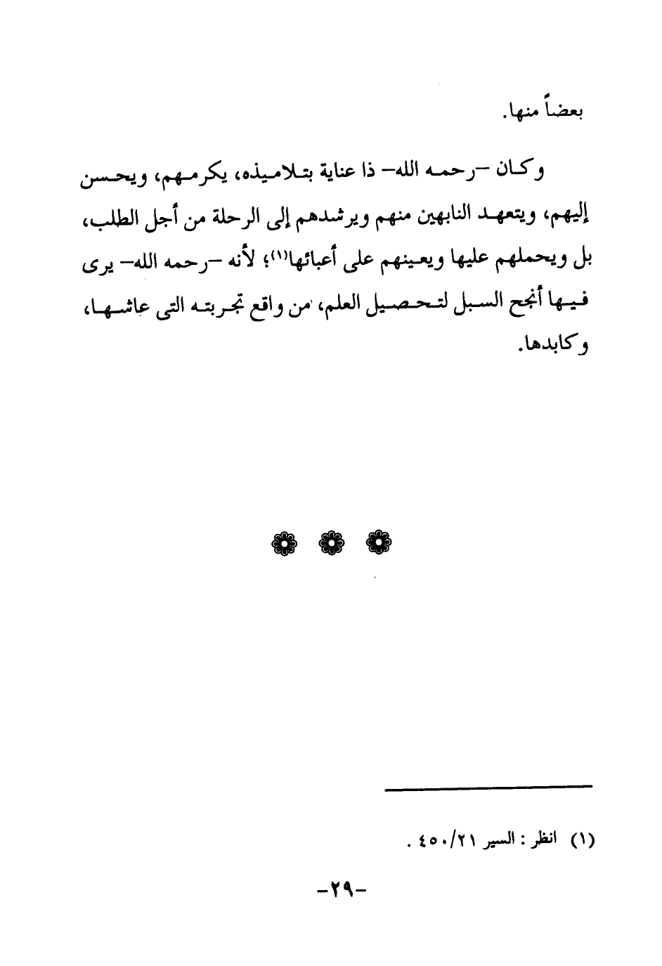 وكان ـ رحمه الله ـ ذا عناية بتلاميذه، يكرمهم، ويحسن إليهم، ويتعهد النابهين منهم ويرشدهم إلى الرحلة من أجل الطلب، بل ويحملهم عليها ويعينهم على أعبائها 1؛ لأنه ـ رحمه الله ـ يرى فيها أنجح السبل لتحصيل العلم، من واقع تجربته التي عاشها، وكابدها.