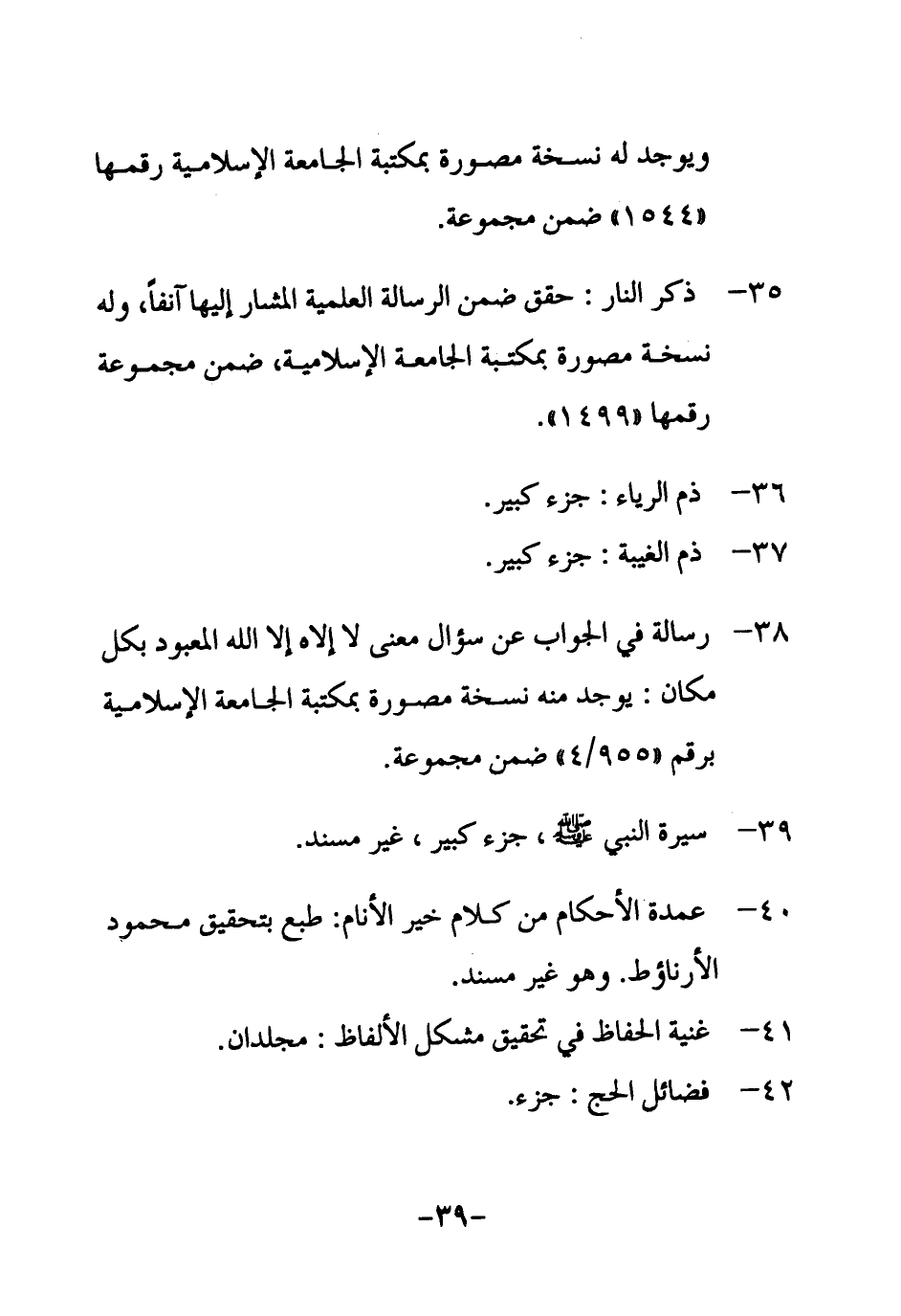 35ـ ذكر النار: حقق ضمن الرسالة العلمية المشار إليها آنفاً، وله نسخة مصورة بمكتبة الجامعة الإسلامية، ضمن مجموعة رقمها ((1499)) .