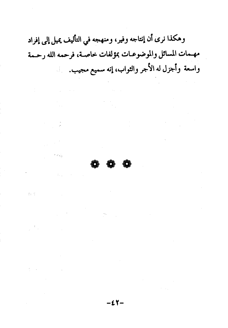 وهكذا نرى أن إنتاجه وفير، ومنهجه في التأليف يميل إلى إفراد مهمات المسائل والموضوعات بمؤلفات خاصة، فرحمه الله رحمة واسعة وأجزل له الأجر والثواب، إنه سميع مجيب.
