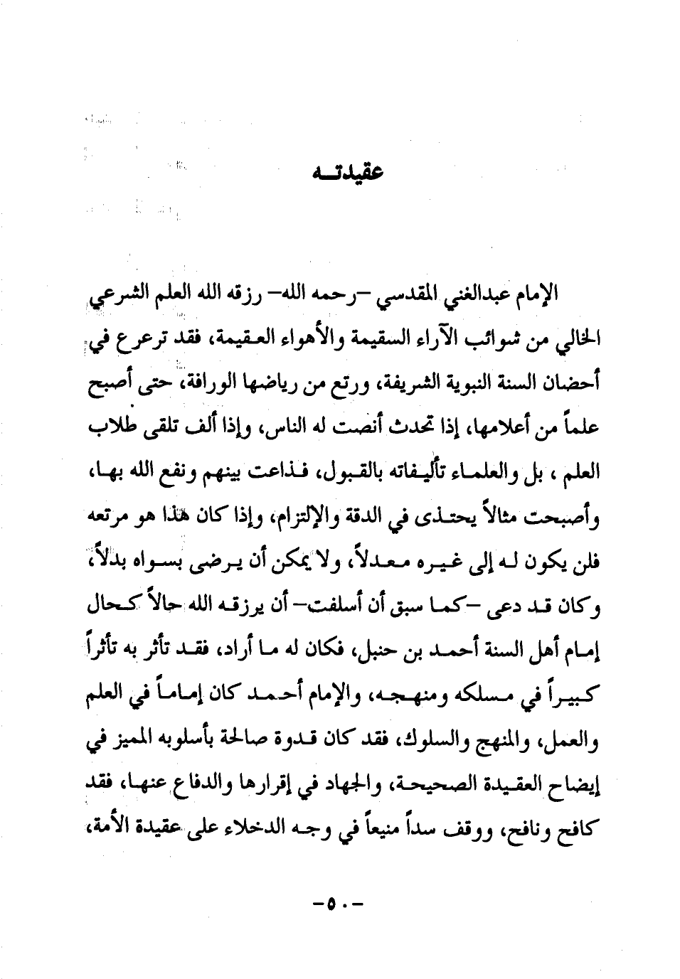 الإمام عبد الغني المقدسي ـ رحمه الله ـ رزقه الله العلم الشرعي الخالي من شوائب الآراء السقيمة والأهواء العقيمة، فقد ترعرع في أحضان السنة النبوية الشريفة، ورتع من رياضها الورافة، حتى أصبح علماً من أعلامها، إذا تحدث أنصت له الناس، وإذا ألف تقلى طلاب العلم، بل والعلماء تأليفاته بالقبول، فذاعت بينهم ونفع الله بها، وأصبحت مثالاً يحتذى في الدقة والإلتزام، وإذا كان هذا هو مرتعه فلن يكون له إلى غيره معدلاً، ولا يمكن أن يرضى بسواه بدلاً وكان قد دعى ـ كما سبق أن أسلفت ـ أن يرزقه الله حالاً كحال إمام أهل السنة أحمد بن حنبل، فكان له ما أراد، فقد تأثر به تأثراً كبيراً في مسلكه ومنهجه، والإمام أحمد كان إماماً في العلم والعمل، والمنهج والسلوك، فقد كان قدوة صالحة بأسلوبه المميز في إيضاح العقيدة الصحيحة، والجهاد في إقرارها والدفاع عنها، فقد كافح ونافح، ووقف سداً منيعاً في وجه الدخلاء على عقيدة الأمة،