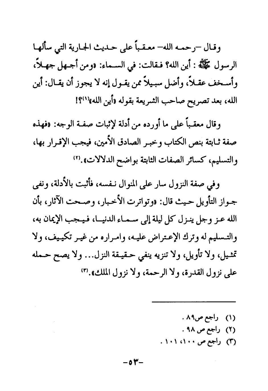 وقال ـ رحمه الله ـ معقباً على حديث الجارية التي سألها الرسول صلى الله عليه وسلم: أين الله؟ فقالت: في السماء: " ومن أجهل جهلاً، وأسخف عقلاً، وأضل سبيلاً ممن يقول إنه لا يجوز أن يقال: أين الله، بعد تصريح صاحب الشريعة بقوله " أين الله "؟! 1