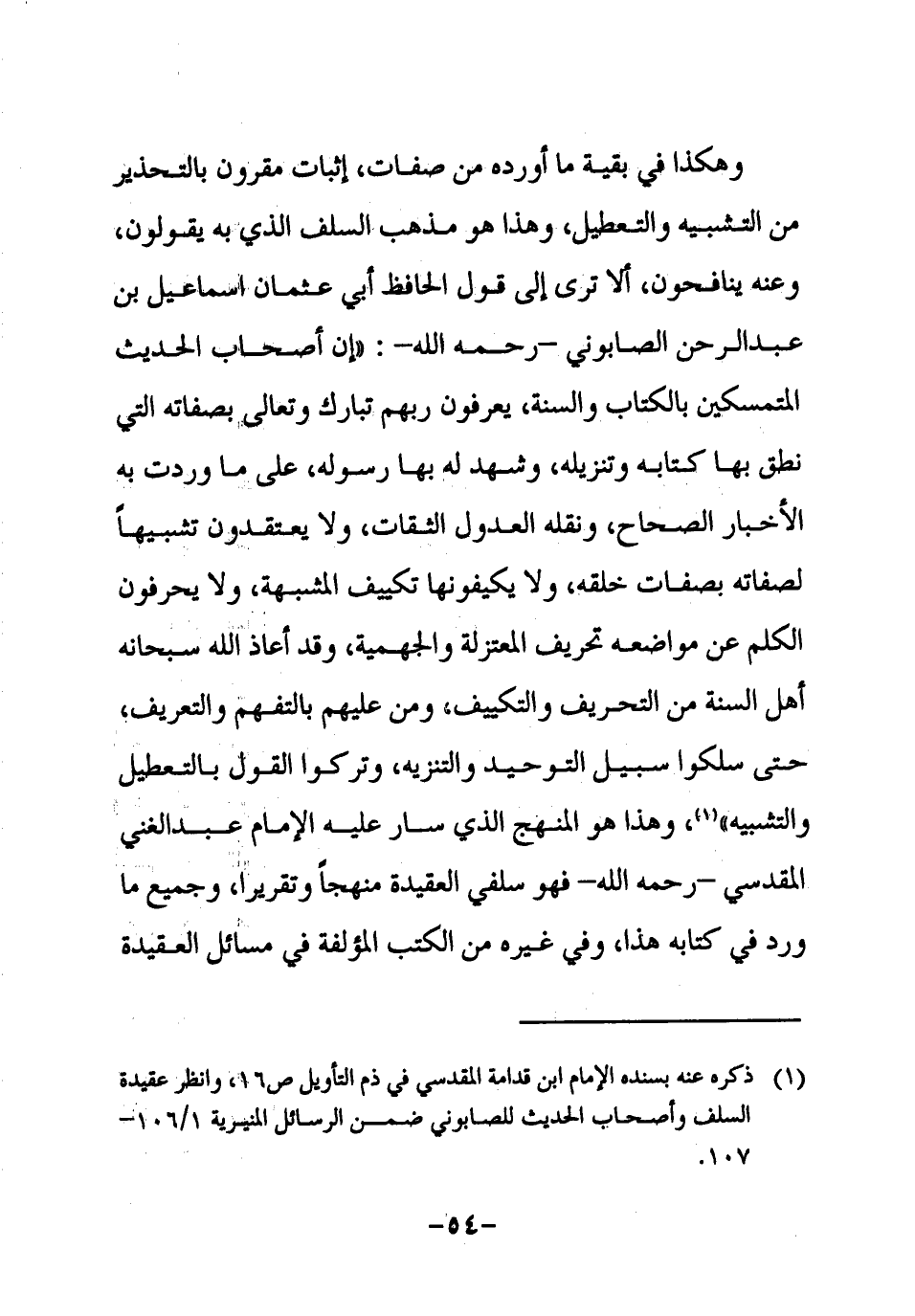 وهكذا في بقية ما أورده من صفات، إثبات مقرون بالتحذير من التشبيه والتعطيل، وهذا هو مذهب السلف الذي به يقولون، وعنه ينافحون، ألا ترى إلى قول الحافظ أبي عثمان إسماعيل بن عبد الرحمن الصابوني ـ رحمه الله ـ: " إن أصحاب الحديث المتمسكين بالكتاب والسنة، يعرفون ربهم تبارك وتعالى بصفاته التي نطق بها كتابه وتنزيله، وشهد له بها رسوله، على ما وردت به الأخبار الصحاح، ونقله العدول الثقات، ولا يعتقدون تشبيهاً لصفاته بصفات خلقه، ولا يكيفونها تكييف المشبهة، ولا يحرفون الكلم عن مواضعه تحريف المعتزلة والجهمية، وقد أعاذ الله سبحانه أهل السنة من التحريف والتكييف، ومَنَّ عليهم بالتفهم والتعريف، حتى سلكوا سبيل التوحيد والتنزيه، وتركوا القول بالتعطيل والتشبيه"1، وهذا هو المنهج الذي سار عليه الإمام عبد الغني المقدسي ـ رحمه الله ـ فهو سلفي العقيدة منهجاً وتقريراً، وجميع ما ورد في كتابه هذا، وفي غيره من الكتب المؤلفة في مسائل العقيدة