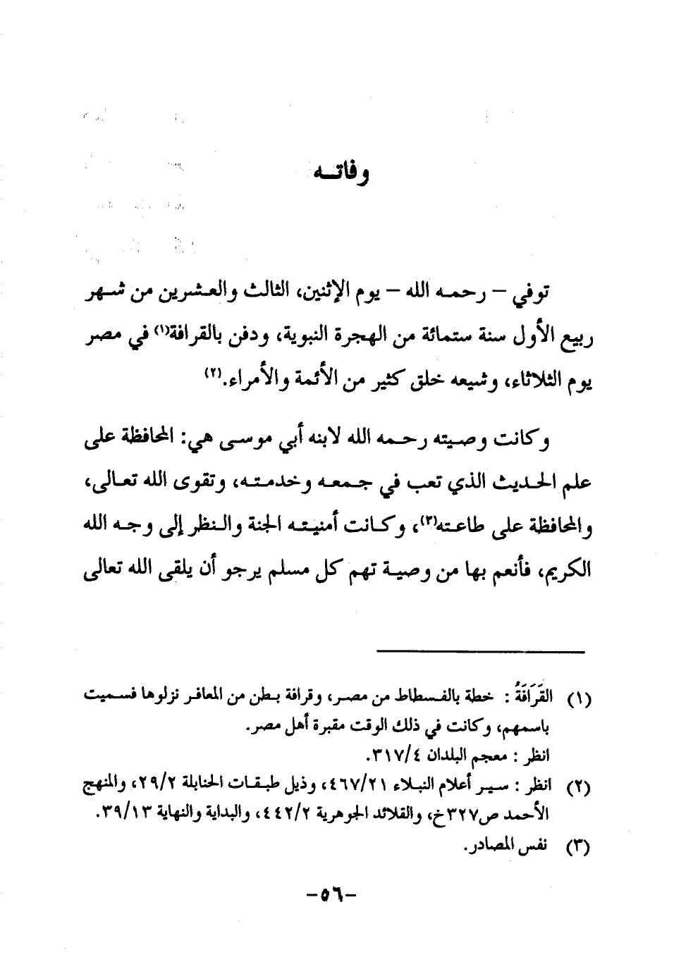 1 القَرَافَةُ: خطة بالفسطاط من مصر، وقرافة بطن من المعافر نزلوها فسميت باسمهم، وكانت في ذلك الوقت مقبرة أهل مصر.