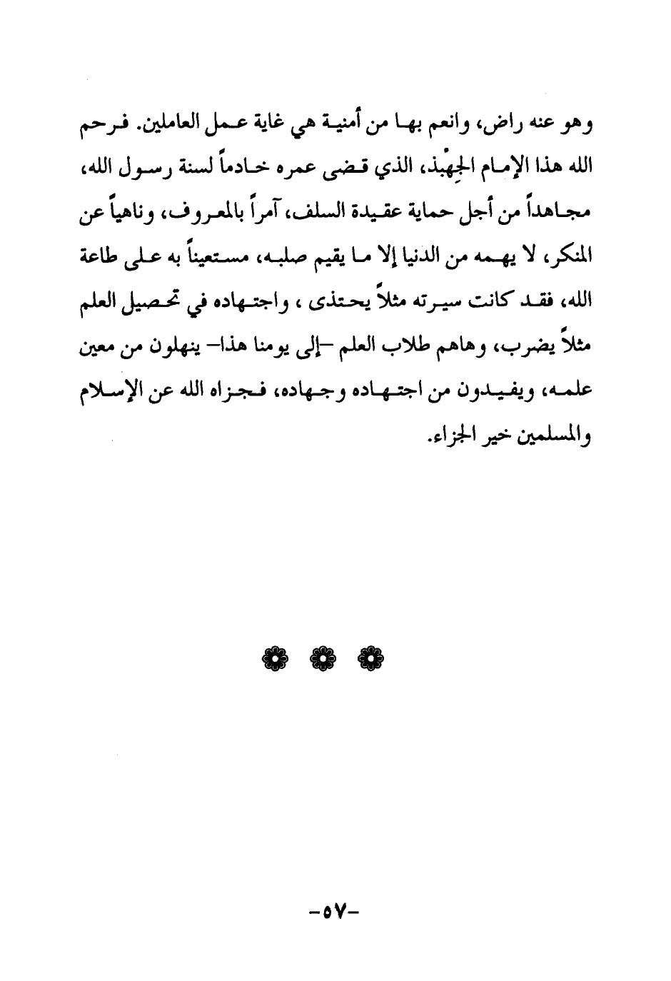 وهو عنه راض، وأنعم بها من أمنية هي غاية عمل العاملين. فرحم الله هذا الإمام الجِهْبذ، الذي قضى عمره خادماً لسنة رسول الله، مجاهداً من أجل حماية عقيدة السلف، آمراً بالمعروف، وناهياً عن المنكر، لا يهمه من الدنيا إلا ما يقيم صلبه، مستعيناً به على طاعة الله، فقد كانت سيرته مثلاً يحتذى، واجتهاده في تحصيل العلم مثلاُ يضرب، وهاهم طلاب العلم ـ إلى يومنا هذا ـ ينهلون من معين علمه، ويفيدون من اجتهاده وجهاده، فجزاه الله عن الإسلام والمسلمين خير الجزاء.