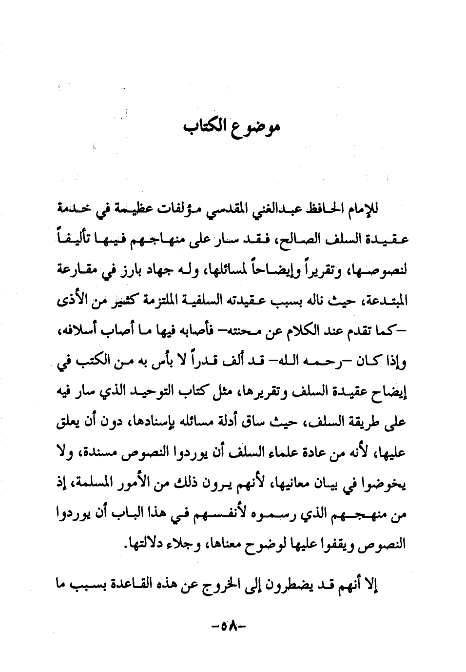 للإمام الحافظ عبد الغني المقدسي مؤلفات عظيمة في خدمة عقيدة السلف الصالح، فقد سار على منهاجهم فيها تأليفاً لنصوصها، وتقريراً وإيضاحاً لمسائلها، وله جهاد بارز في مقارعة المبتدعة، حيث ناله بسبب عقيدته السلفية الملتزمة كثير من الأذى ـ كما تقدم عند الكلام عن محنته ـ فأصابه فيها ما أصاب أسلافه، وإذا كان ـ رحمه الله ـ قد ألف قدراً لا بأس به من الكتب في إيضاح عقيدة السلف وتقريرها، مثل كتاب التوحيد الذي سار فيه على طريقة السلف، حيث ساق أدلة مسائله بإسنادها، دون أن يعلق عليها، لأنه من عادة علماء السلف أن يوردوا النصوص مسندة، ولا يخوضوا في بيان معانيها، لأنهم يرون ذلك من الأمور المسلمة، إذ من منهجهم الذي رسموه لأنفسهم في هذا الباب أن يوردوا النصوص ويقفوا عليها لوضوح معناها، وجلاء دلالتها.