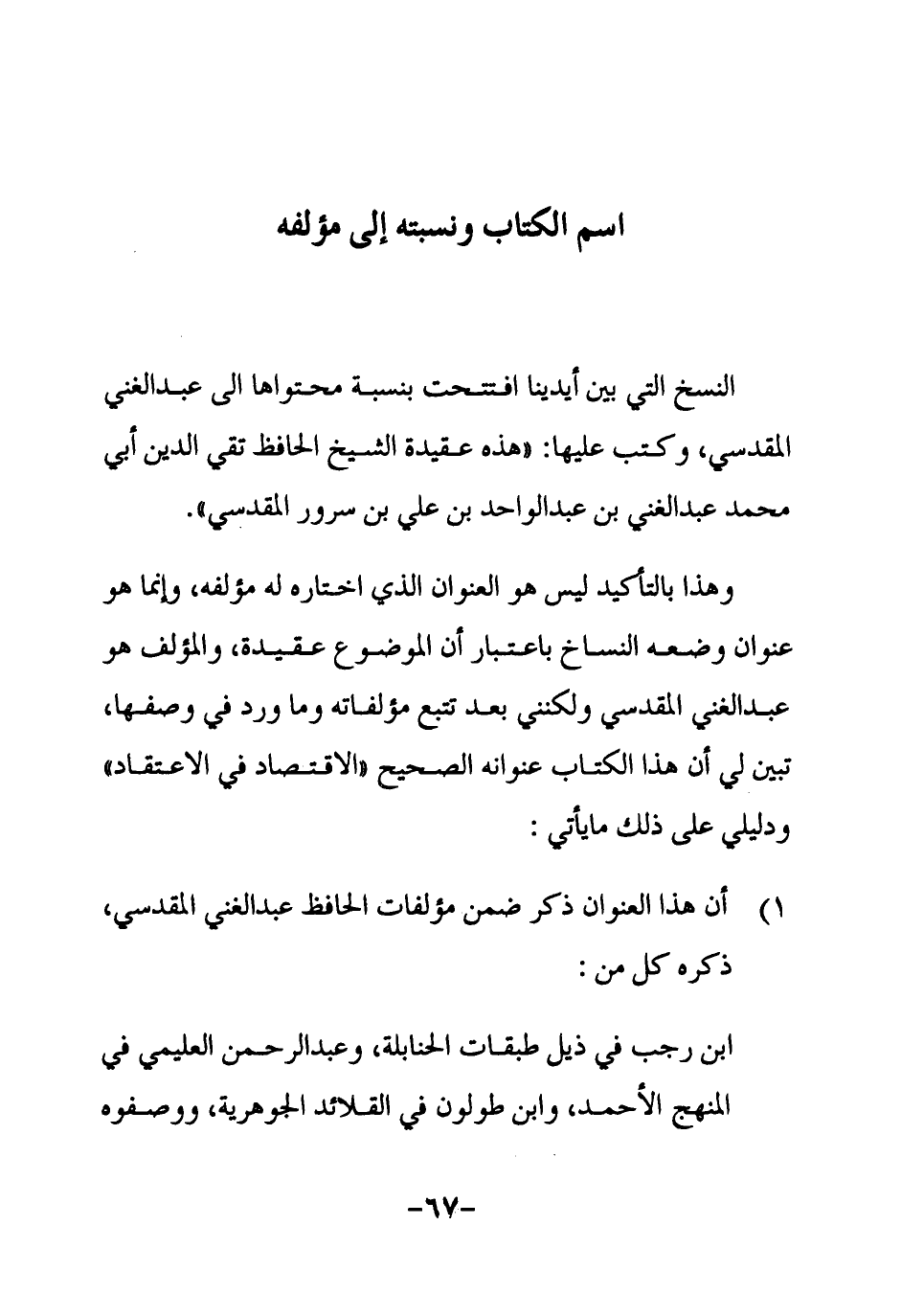 وهذا بالتأكيد ليس هو العنوان الذي اختاره له مؤلفه، وإنما هو عنوان وضعه النساخ باعتبار أن الموضوع عقيدة، والمؤلف هو عبد الغني المقدسي ولكنني بعد تتبع مؤلفاته وما ورد في وصفها، تبين لي أن هذا الكتاب عنوانه الصحيح ((الاقتصاد في الاعتقاد)) ودليلي على ذلك ما يأتي: