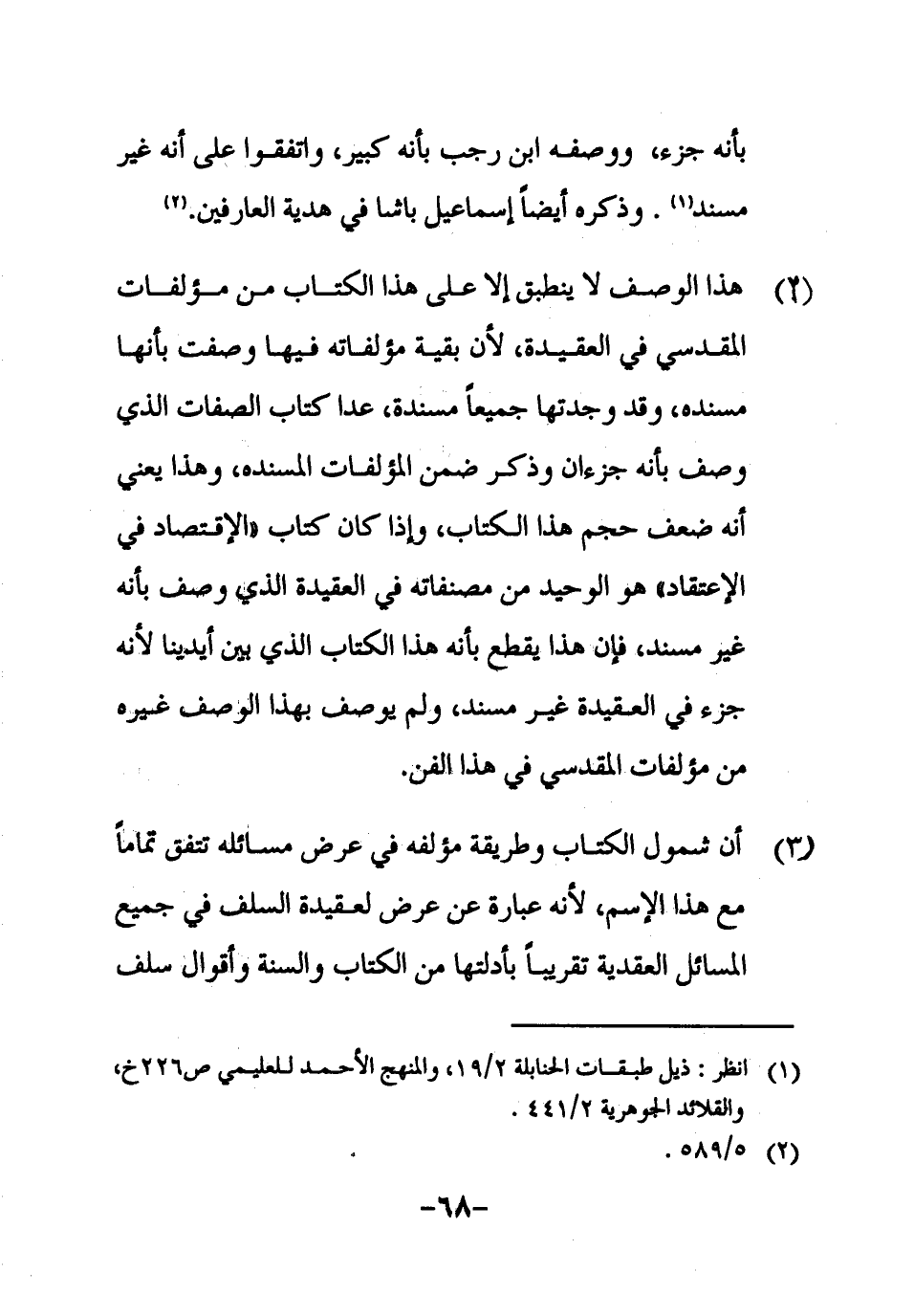 2 ـ هذا الوصف لا ينطبق إلا على هذا الكتاب من مؤلفات المقدسي في العقيدة، لأن بقية مؤلفاته فيها وصفت بأنها مسندة، وقد وجدتها جميعاً مسندة، عدا كتاب الصفات الذي وصف بأنه جزءان وذكر ضمن المؤلفات المسندة، وهذا يعني أنه ضعف حجم هذا الكتاب، وإذا كان كتاب ((الاقتصاد في الاعتقاد)) هو الوحيد من مصنفاته في العقيدة الذي وصف بأنه غير مسند، فإن هذا يقطع بأنه هذا الكتاب الذي بين أيدينا لأنه جزء في العقيدة غير مسند، ولم يوصف بهذا الوصف غيره من مؤلفات المقدسي في هذا الفن.