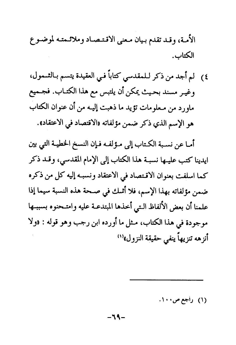 4 ـ لم أجد من ذكر للمقدسي كتاباً في العقيدة يتسم بالشمول، وغير مسند بحيث يمكن أن يلتبس مع هذا الكتاب. فجميع ما ورد من معلومات تؤيد ما ذهبت إليه من أن عنوان الكتاب هو الاسم الذي ذكر ضمن مؤلفاته ((الاقتصاد في الاعتقاد)) .