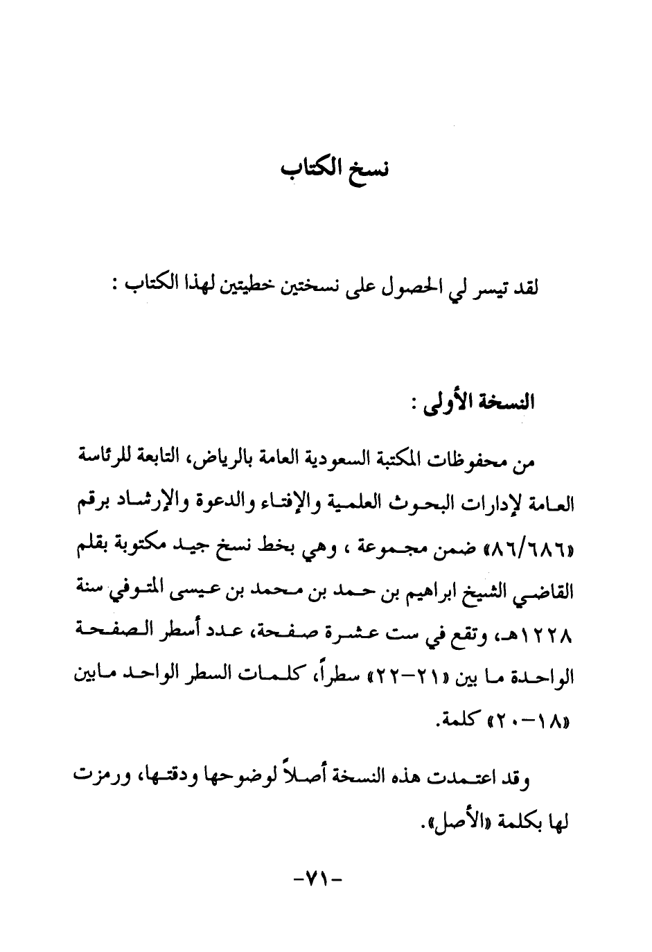 وقد اعتمدت هذه النسخة أصلاً لوضوحها ودقتها، ورمزت لها بكلمة ((الأصل)) .