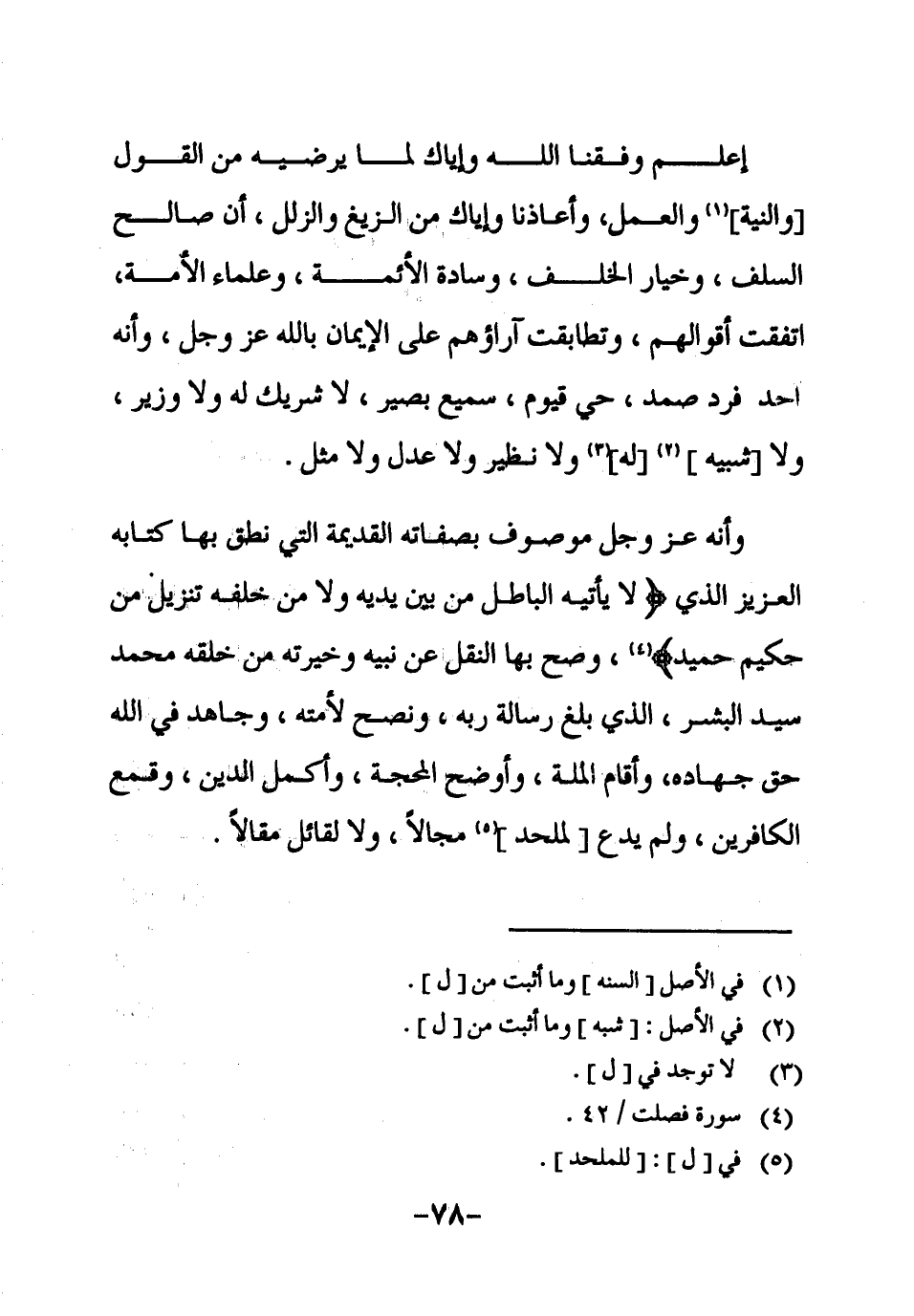 اعلم وفقنا الله وإياك لما يرضيه من القول [والنية] 1 والعمل، وأعاذنا وإياك من الزيغ والزلل، أن صالح السلف، وخيار الخلف، وسادة الأئمة، وعلماء الأمة، اتفقت أقوالهم، وتطابقت آراؤهم على الإيمان بالله عز وجل، وأنه أحد فرد صمد، حي قيوم، سميع بصير، لا شريك له ولا وزير، ولا [شبيه] 2 [له] 3 ولا نظير ولا عِدْل ولا مثل.