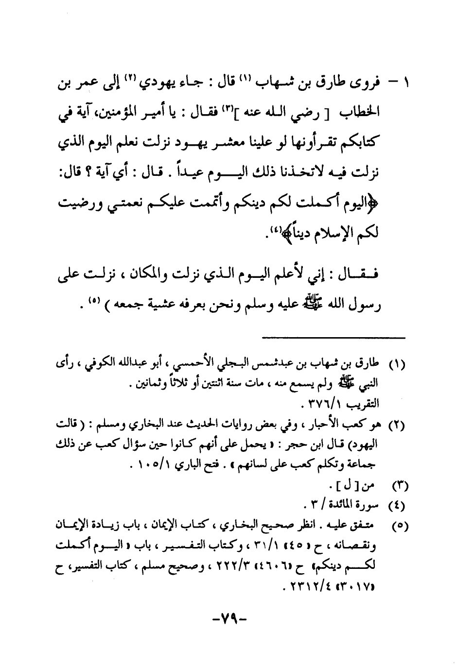 1 ـ فروى طارق بن شهاب1 قال: جاء يهودي2 إلى عمر بن الخطاب [رضي الله عنه] 3 فقال: يا أمير المؤمنين، آية في كتابكم تقرأونها لو علينا معشر يهود نزلت نعلم اليوم الذي نزلت فيه لاتخذنا ذلك اليوم عيداً. قال: أي آية؟ قال: {الْيَوْمَ أَكْمَلْتُ لَكُمْ دِينَكُمْ وَأَتْمَمْتُ عَلَيْكُمْ نِعْمَتِي وَرَضِيتُ لَكُمُ الأِسْلامَ دِيناً} 4.