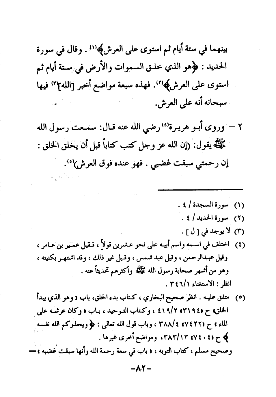 5 متفق عليه. انظر صحيح البخاري، كتاب بدء الخلق، باب ((وهو الذي يبدأ الخلق)) ح ((3194)) 2/419، وكتاب التوحيد، باب ((وكان عرشه على الماء)) ح ((7422)) 4/388، وباب قول الله تعالى: {وَيُحَذِّرُكُمُ اللَّهُ نَفْسَهُ} ح ((7404)) 13/383، ومواضع أخرى غيرها.