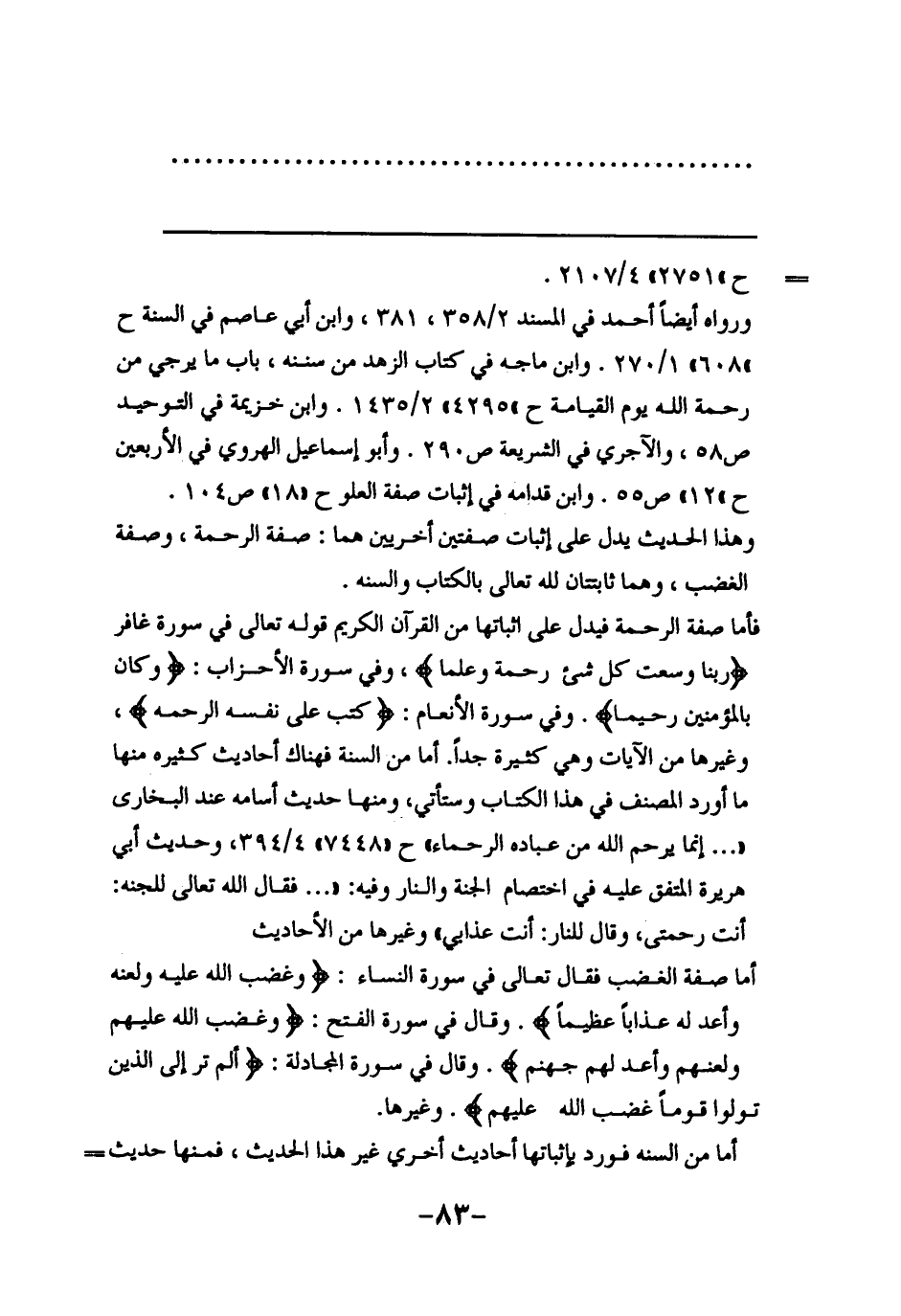 وهذا الحديث يدل على إثبات صفتين أخريين هما: صفة الرحمة، وصفة الغضب، وهما ثابتتان لله تعالى بالكتاب والسنة. فأما صفة الرحمة فيدل على إثباتها من القرآن الكريم قوله تعالى في سورة غافر {رَبَّنَا وَسِعْتَ كُلَّ شَيْءٍ رَحْمَةً وَعِلْماً} ، وفي سورة الأحزاب: {وَكَانَ بِالْمُؤْمِنِينَ رَحِيماً} . وفي سورة الأنعام: {كَتَبَ عَلَى نَفْسِهِ الرَّحْمَةَ} ، وغيرها من الآيات وهي كثيرة جداً. أما من السنة فهناك أحاديث كثيرة منها ما أورد المصنف في هذا الكتاب وستأتي، ومنها حديث أسامة عند البخاري " … إنما يرحم الله من عباده الرحماء " ح ((7448)) 4/394، وحديث أبي هريرة المتفق عليه في اختصام الجنة والنار وفيه: " … فقال الله تعالى للجنة: أنت رحمتي، وقال للنار: أنت عذابي " وغيرها من الأحاديث.
