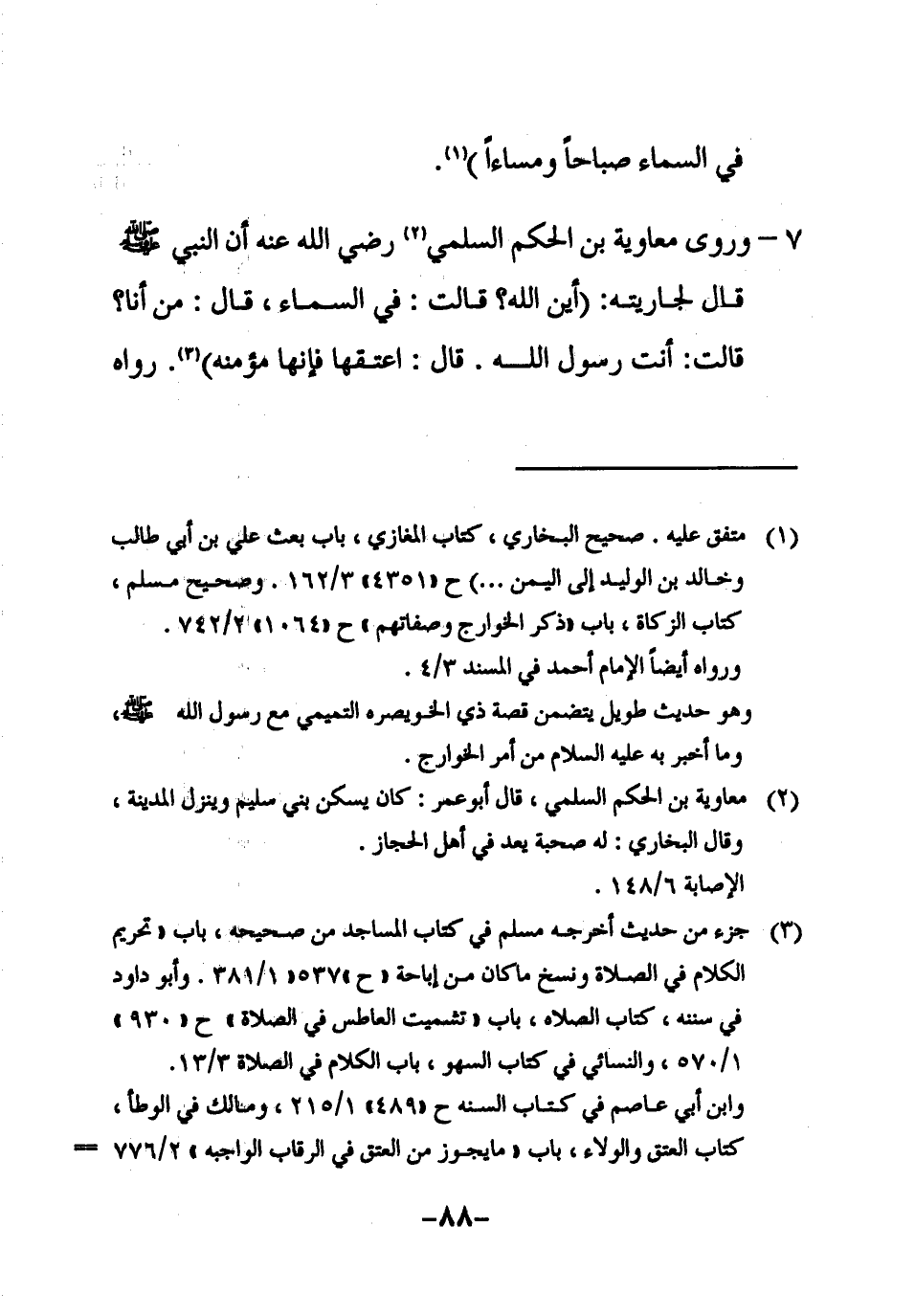 7 ـ وروى معاوية بن الحكم السلمي2 رضي الله عنه أن النبي صلى الله عليه وسلم قال لجاريته: " أين الله؟ قالت: في السماء، قال: من أنا؟ قالت: أنت رسول الله. قال: اعتقها فإنها مؤمنة " 3. رواه