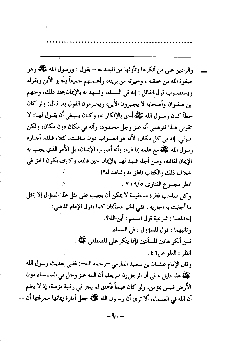 وقال الإمام عثمان بن سعيد الدارمي ـ رحمه الله ـ: ففي حديث رسول الله صلى الله عليه وسلم هذا دليل على أن الرجل إذا لم يعلم أن الله عز وجل في السماء دون الأرض فليس بمؤمن، ولو كان عبداً فأعتق لم يجز في رقبة مؤمنة، إذ لا يعلم أن الله في السماء، ألا ترى أن رسول الله صلى الله عليه وسلم جعل أمارة إيمانها معرفتها أن