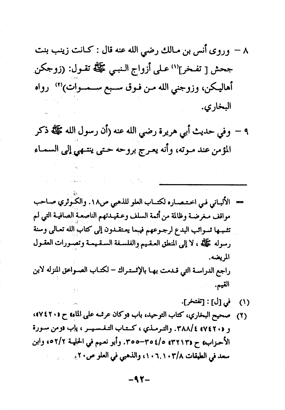 2 صحيح البخاري، كتاب التوحيد، باب ((وكان عرشه على الماء)) ح ((7420)) ، و ((7420)) 4/388. والترمذي، كتاب التفسير، باب ((ومن سورة الأحزاب)) ح ((3213)) 5/354-355. وأبو نعيم في الحلية 2/52، وابن سعد في الطبقات 8/103,106، والذهبي في العلو ص20.