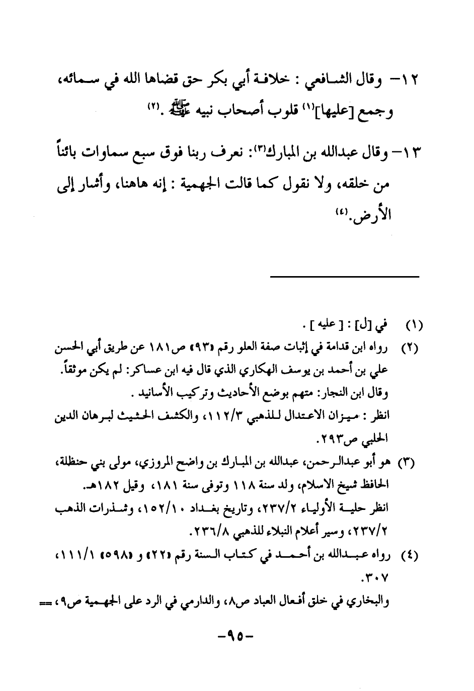 2 رواه ابن قدامة في إثبات صفة العلو رقم ((93)) ص181 عن طريق أبي الحسن علي بن أحمد بن يوسف الهكاري الذي قال فيه ابن عساكر: لم يكن موثقاً. وقال ابن النجار: متهم بوضع الأحاديث وتركيب الأسانيد.