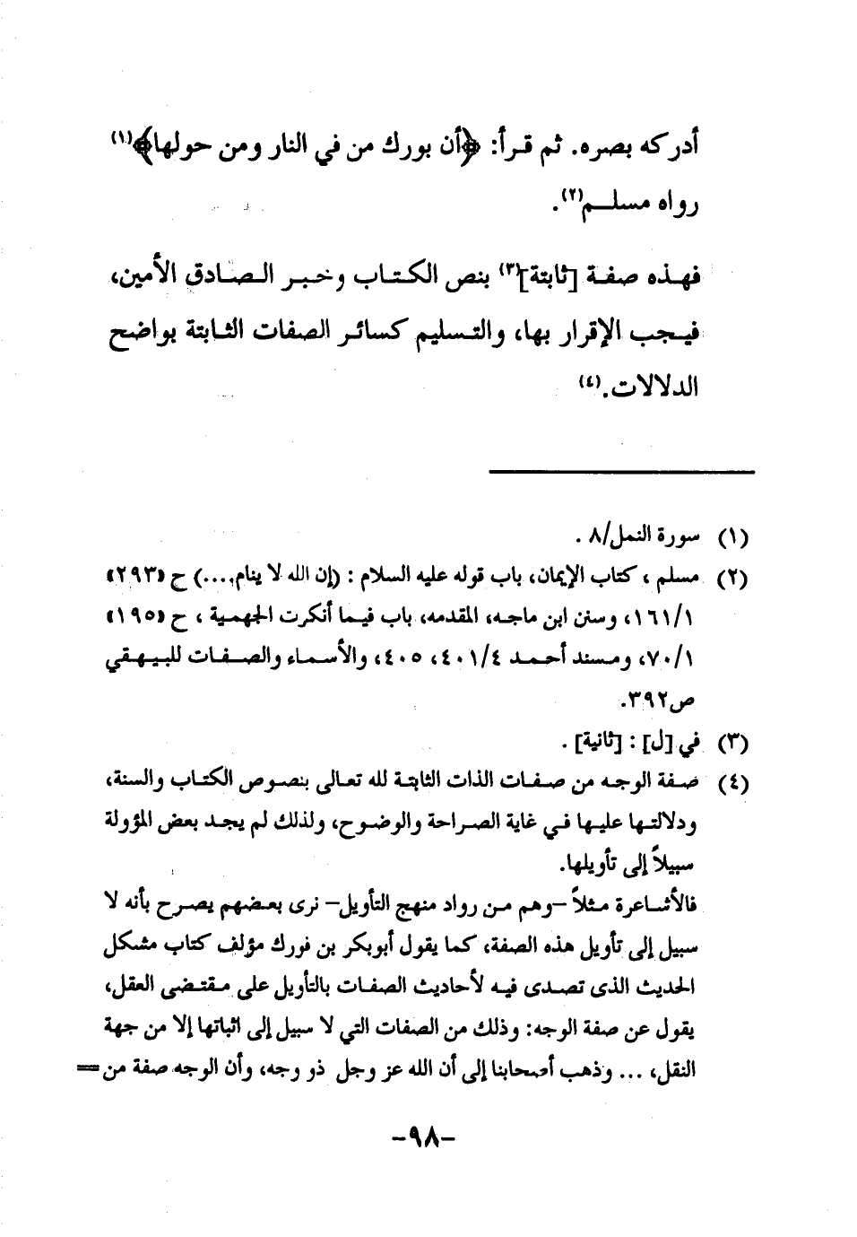 4 صفة الوجه من صفات الذات الثابتة لله تعالى بنصوص الكتاب والسنة، ودلالتها عليها في غاية الصراحة والوضوح، ولذلك لم يجد بعض المؤولة سبيلاً إلى تأويلها.