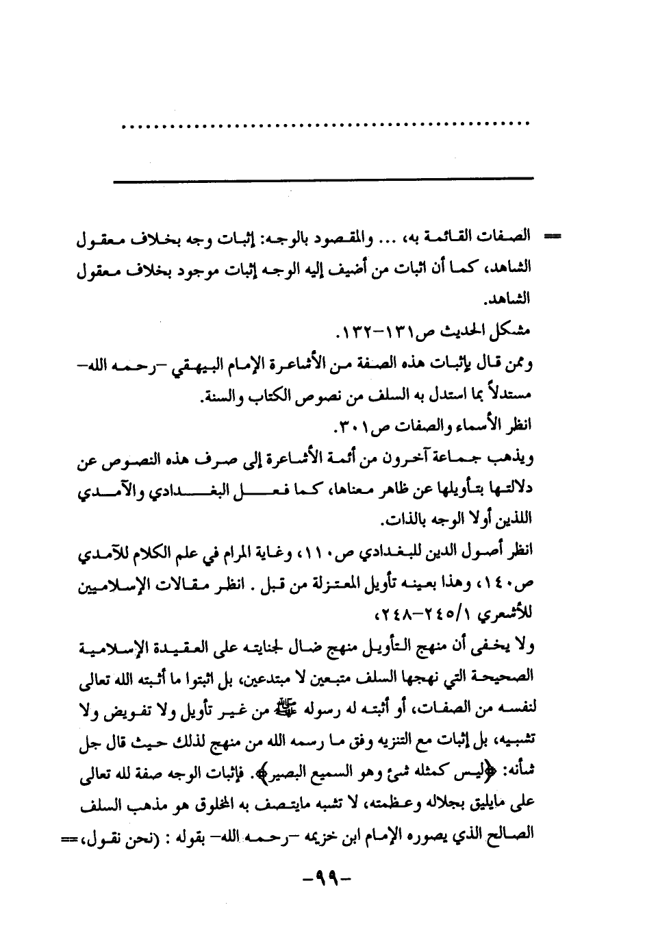 الصفات القائمة به، … والمقصود بالوجه: إثبات وجه بخلاف معقول الشاهد، كما أن إثبات من أضيف إليه الوجه إثبات موجود بخلاف معقول الشاهد.