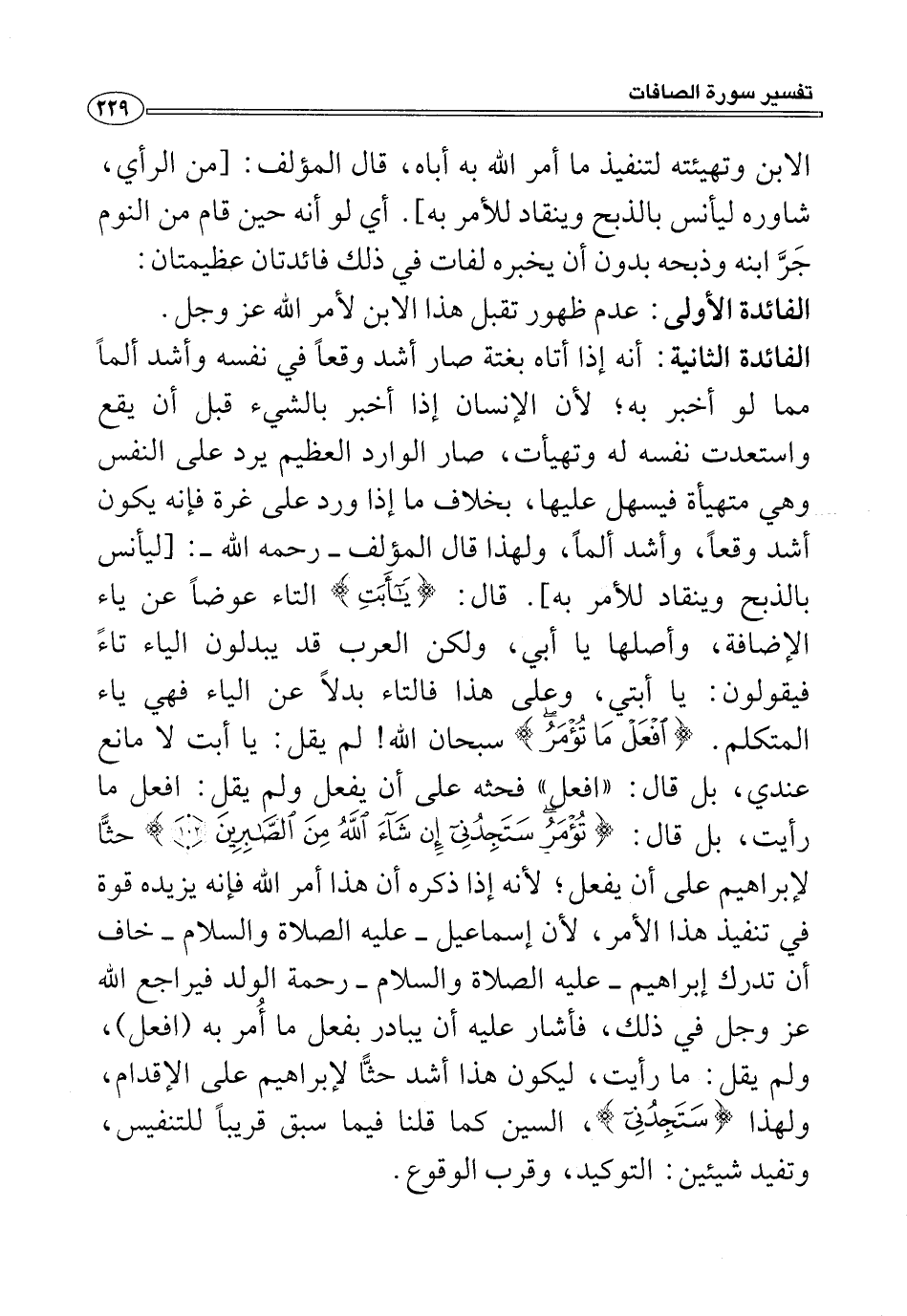 الفائدة الثانية: أنه إذا أتاه بغتة صار أشد وقعًا في نفسه وأشد ألمًا مما لو أخبر به؛ لأن الإنسان إذا أخبر بالشيء قبل أن يقع واستعدت نفسه له وتهيأت، صار الوارد العظيم يرد على النفس وهي متهيأة فيسهل عليها، بخلاف ما إذا ورد على غرة فإنه يكون أشد وقعًا، وأشد ألمًا، ولهذا قال المؤلف -رحمه الله-: [ليأنس بالذبح وينقاد للأمر به]. قال: {يَاأَبَتِ} التاء عوضًا عن ياء الإضافة، وأصلها يا أبي، ولكن العرب قد يبدلون الياء تاءً فيقولون: يا أبتي، وعلى هذا فالتاء بدلًا عن الياء فهي ياء المتكلم. {افْعَل مَا تُؤْمَرُ} سبحان الله! لم يقل: يا أبت لا مانع عندي، بل قال: "افعل" فحثه على أن يفعل ولم يقل: افعل ما رأيت، بل قال: {تُؤْمَرُ سَتَجِدُنِي إِنْ شَاءَ اللَّهُ مِنَ الصَّابِرِينَ} حثًّا لإبراهيم على أن يفعل؛ لأنه إذا ذكره أن هذا أمر الله فإنه يزيده قوة في تنفيذ هذا الأمر، لأن إسماعيل -عليه الصلاة والسلام- خاف أن تدرك إبراهيم -عليه الصلاة والسلام- رحمة الولد فيراجع الله عزَّ وجلَّ في ذلك، فأشار عليه أن يبادر بفعل ما أُمر به (افعل)، ولم يقل: ما رأيت، ليكون هذا أشد حثًّا لإبراهيم على الإقدام، ولهذا {سَتَجِدُنِي}، السين كما قلنا فيما سبق قريبًا للتنفيس، وتفيد شيئين: التوكيد، وقرب الوقوع.