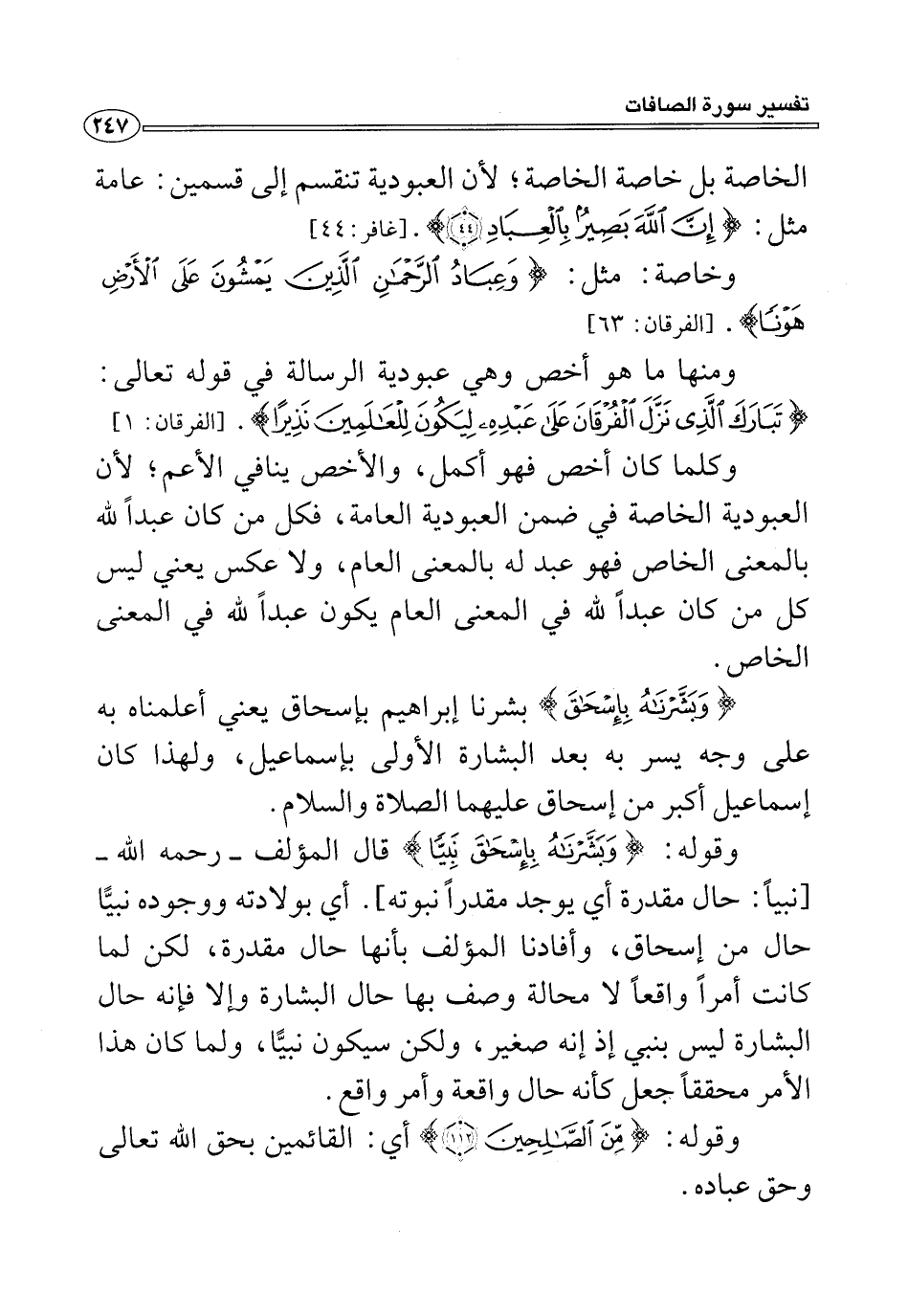 ومنها ما هو أخص وهي عبودية الرسالة في قوله تعالى: {تَبَارَكَ الَّذِي نَزَّلَ الْفُرْقَانَ عَلَى عَبْدِهِ لِيَكُونَ لِلْعَالَمِينَ نَذِيرًا (١)}. [الفرقان: ١]