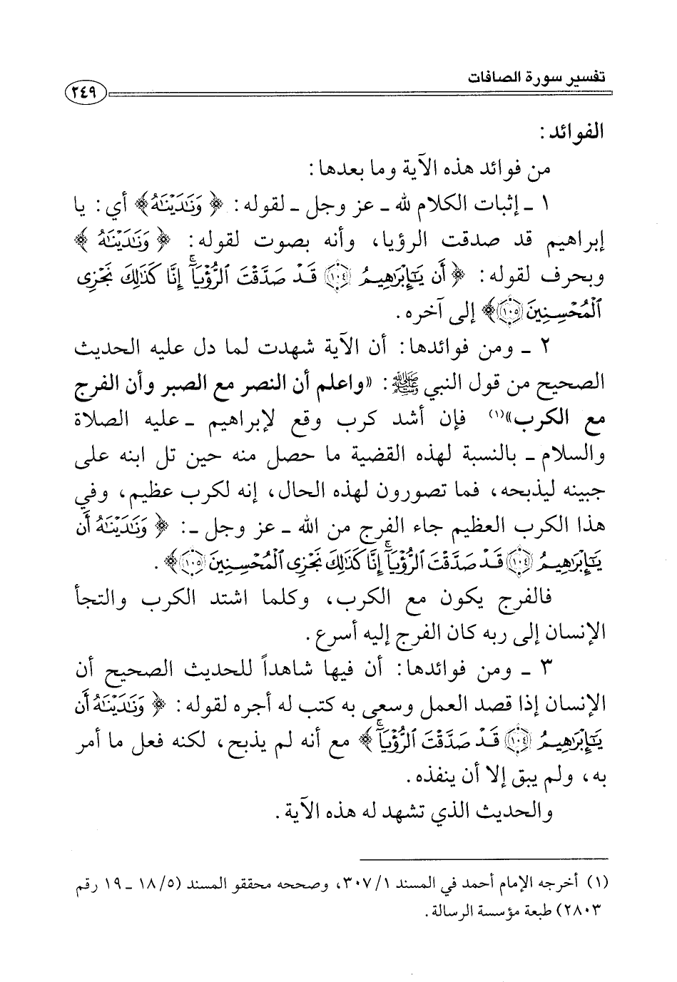 ٣ - ومن فوائدها: أن فيها شاهدًا للحديث الصحيح أن الإنسان إذا قصد العمل وسعى به كتب له أجره لقوله: {وَنَادَيْنَاهُ أَنْ يَاإِبْرَاهِيمُ (١٠٤) قَدْ صَدَّقْتَ الرُّؤْيَا} مع أنه لم يذبح، لكنه فعل ما أمر به، ولم يبق إِلَّا أن ينفذه.