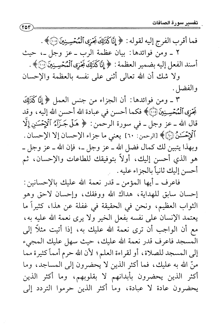 ٣ - ومن فوائدها: أن الجزاء من جنس العمل {إِنَّا كَذَلِكَ نَجْزِي الْمُحْسِنِينَ (١٠٥)}. فكما أحسن في عبادة الله أحسن الله إليه، وقد قال الله -عَزَّ وَجَلَّ- في سورة الرحمن: {هَلْ جَزَاءُ الْإِحْسَانِ إِلَّا الْإِحْسَانُ (٦٠)} [الرحمن: ٦٠] يعني ما جزاء الإحسان إلا الإحسان. وبهذا يتبين لك كمال فضل الله -عَزَّ وَجَلَّ-، فإن الله -عَزَّ وَجَلَّ- هو الذي أحسن إليك، أولًا بتوفيقك للطاعات والإحسان, ثم أحسن إليك ثانيًا بالجزاء عليه.