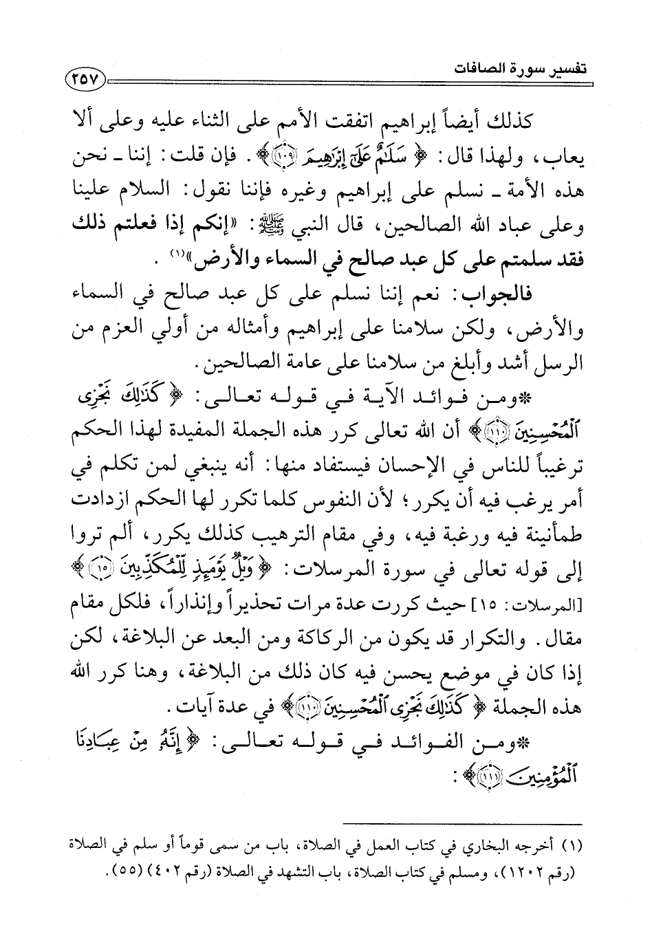 كذلك أيضًا إبراهيم اتفقت الأمم على الثناء عليه وعلى ألا يعاب، ولهذا قال: {سَلَامٌ عَلَى إِبْرَاهِيمَ (١٠٩)}. فإن قلت: إننا -نحن هذه الأمة- نسلم على إبراهيم وغيره فإننا نقول: السلام علينا وعلى عباد الله الصالحين، قال النبي - صلى الله عليه وسلم -: "إنكم إذا فعلتم ذلك فقد سلمتم على كل عبد صالح في السماء والأرض" (¬١).