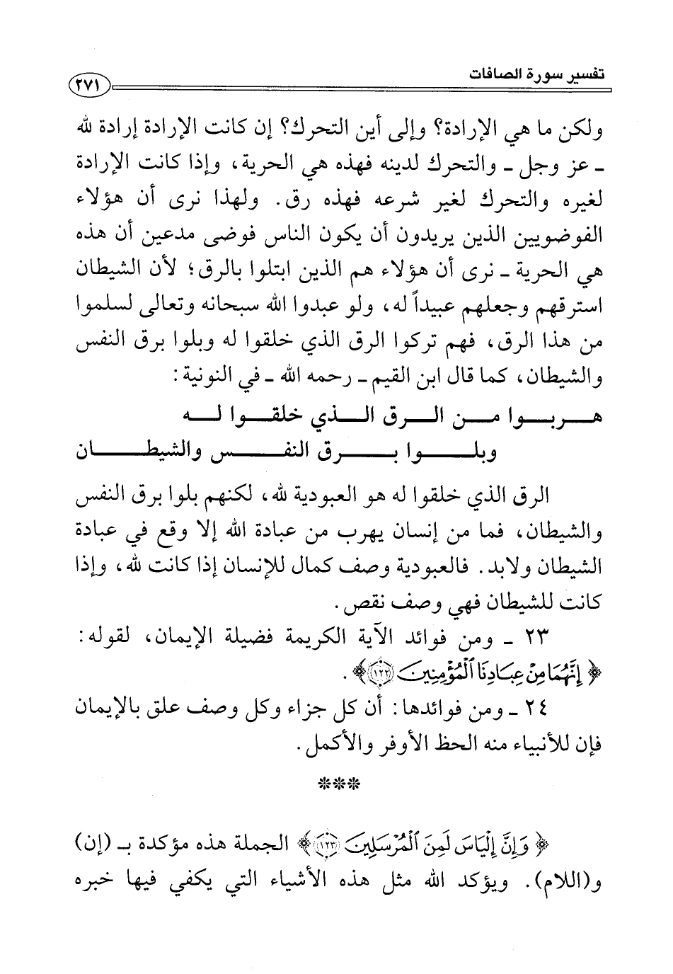 ٢٣ - ومن فوائد الآية الكريمة فضيلة الإيمان، لقوله: {إِنَّهُمَا مِنْ عِبَادِنَا الْمُؤْمِنِينَ (١٢٢)}.