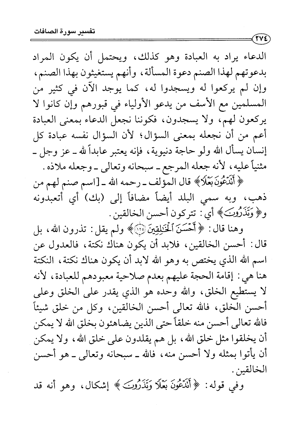 {أَتَدْعُونَ بَعْلًا} قال المؤلف -رحمه الله-[اسم صنم لهم من ذهب، وبه سمي البلد أيضًا مضافًا إلى (بك) أي أتعبدونه {وَتَذَرُونَ} أي: تتركون أحسن الخالقين.