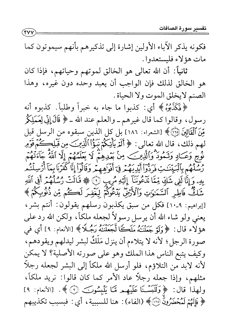 {فَكَذَّبُوهُ} أي: كذبوا ما جاء به خبرًا وطلبًا. كذبوه أنه رسول، وقالوا كما قال غيرهم -والعلم عند الله- {قَالَ إِنِّي لِعَمَلِكُمْ مِنَ الْقَالِينَ (١٦٨)} [الشعراء: ١٦٨] بل كل الذين سبقوه من الرسل قيل لهم ذلك، قال الله تعالى: {أَلَمْ يَأْتِكُمْ نَبَأُ الَّذِينَ مِنْ قَبْلِكُمْ قَوْمِ نُوحٍ وَعَادٍ وَثَمُودَ وَالَّذِينَ مِنْ بَعْدِهِمْ لَا يَعْلَمُهُمْ إِلَّا اللَّهُ جَاءَتْهُمْ رُسُلُهُمْ بِالْبَيِّنَاتِ فَرَدُّوا أَيْدِيَهُمْ فِي أَفْوَاهِهِمْ وَقَالُوا إِنَّا كَفَرْنَا بِمَا أُرْسِلْتُمْ بِهِ وَإِنَّا لَفِي شَكٍّ مِمَّا تَدْعُونَنَا إِلَيْهِ مُرِيبٍ (٩) قَالَتْ رُسُلُهُمْ أَفِي اللَّهِ شَكٌّ فَاطِرِ السَّمَاوَاتِ وَالْأَرْضِ يَدْعُوكُمْ لِيَغْفِرَ لَكُمْ مِنْ ذُنُوبِكُمْ} [إبراهيم: ٩ - ١٠] فكل من سبق يكذبون رسلهم يقولون: أنتم بشر، يعني ولو شاء الله أن يرسل رسولًا لجعله ملكًا، ولكن الله رد على هؤلاء قال: {وَلَوْ جَعَلْنَاهُ مَلَكًا لَجَعَلْنَاهُ رَجُلًا} [الأنعام: ٩] أي في صورة الرجل؛ لأنه لا يتلاءم أن ينزل مَلَكٌ لبشر ليدلهم ويقودهم، وكيف يتبع الناس هذا الملك وهو على صورته الأصلية؟ لا يمكن لأنه لابد من التلاؤم، فلو أرسل الله ملكًا إلى البشر لجعله رجلًا مثلهم، وإذا جعله رجلًا عاد الأمر كما كان قالوا: نريد ملكًا، ولهذا قال: {وَلَلَبَسْنَا عَلَيْهِمْ مَا يَلْبِسُونَ (٩)} [الأنعام: ٩] {فَإِنَّهُمْ لَمُحْضَرُونَ (١٢٧)} (الفاء): هنا للسببية، أي: فبسبب تكذيبهم