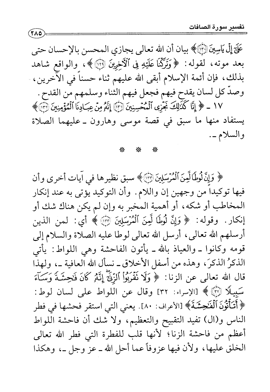 {وَإِنَّ لُوطًا لَمِنَ الْمُرْسَلِينَ (١٣٣)} سبق نظيرها في آيات أخرى وأن فيها توكيدًا من وجهين إن واللام. وأن التوكيد يؤتى به عند إنكار المخاطب أو شكه، أو أهمية المخبر به وإن لم يكن هناك شك أو إنكار. وقوله: {وَإِنَّ لُوطًا لَمِنَ الْمُرْسَلِينَ (١٣٣)} أي: لمن الذين أرسلهم الله تعالى، أرسل الله تعالى لوطا عليه الصلاة والسلام إلى قومه وكانوا -والعياذ بالله- يأتون الفاحشة وهي اللواط: يأتي الذكرُ الذكرَ، وهذه من أسفل الأخلاق -نسأل الله العافية-، ولهذا قال الله تعالى عن الزنا: {وَلَا تَقْرَبُوا الزِّنَا إِنَّهُ كَانَ فَاحِشَةً وَسَاءَ سَبِيلًا (٣٢)} [الإسراء: ٣٢] وقال عن اللواط على لسان لوط: {أَتَأْتُونَ الْفَاحِشَةَ} [الأعراف: ٨٠]. يعني التي استقر فحشها في فطر الناس و (ال) تفيد التقبيح والتعظيم، ولا شك أن فاحشة اللواط أعظم من فاحشة الزنا؛ لأنها قلب للفطرة التي فطر الله تعالى الخلق عليها، ولأن فيها عزوفًا عما أحل الله -عَزَّ وَجَلَّ-، وهكذا