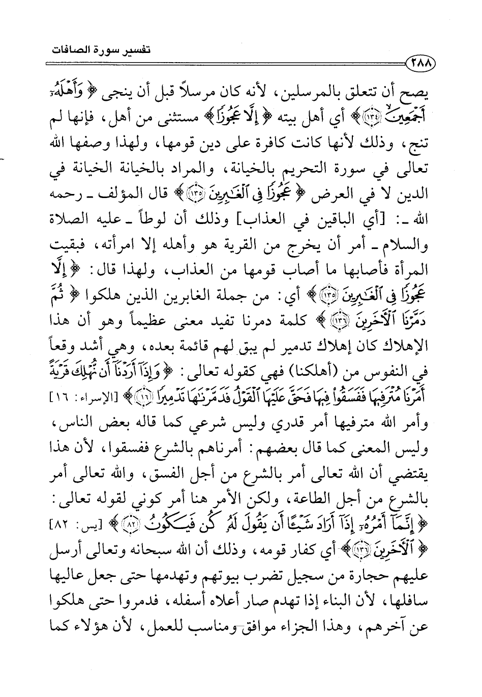 يصح أن تتعلق بالمرسلين؛ لأنه كان مرسلًا قبل أن ينجى {وَأَهْلَهُ أَجْمَعِينَ (١٣٤)} أي أهل بيته {إِلَّا عَجُوزًا} مستثنى من أهل، فإنها لم تنج، وذلك لأنها كانت كافرة على دين قومها, ولهذا وصفها الله تعالى في سورة التحريم بالخيانة، والمراد بالخيانة الخيانة في الدين لا في العرض {عَجُوزًا فِي الْغَابِرِينَ (١٣٥)} قال المؤلف -رحمه الله-: [أي الباقين في العذاب] وذلك أن لوطًا -عليه الصلاة والسلام- أمر أن يخرج من القرية هو وأهله إلا امرأته، فبقيت المرأة فأصابها ما أصاب قومها من العذاب، ولهذا قال: {إِلَّا عَجُوزًا فِي الْغَابِرِينَ (١٣٥)} أي: من جملة الغابرين الذين هلكوا {ثُمَّ دَمَّرْنَا الْآخَرِينَ (١٣٦)} كلمة دمرنا تفيد معنى عظيمًا وهو أن هذا الإهلاك كان إهلاك تدمير لم يبق لهم قائمة بعده، وهي أشد وقعًا في النفوس من (أهلكنا) فهي كقوله تعالى: {وَإِذَا أَرَدْنَا أَنْ نُهْلِكَ قَرْيَةً أَمَرْنَا مُتْرَفِيهَا فَفَسَقُوا فِيهَا فَحَقَّ عَلَيْهَا الْقَوْلُ فَدَمَّرْنَاهَا تَدْمِيرًا (١٦)} [الإسراء: ١٦] وأمر الله مترفيها أمر قدري وليس شرعي كما قاله بعض الناس، وليس المعنى كما قال بعضهم: أمرناهم بالشرع ففسقوا, لأن هذا يقتضي أن الله تعالى أمر بالشرع من أجل الفسق، والله تعالى أمر بالشرع من أجل الطاعة، ولكن الأمر هنا أمر كوني لقوله تعالى: {إِنَّمَا أَمْرُهُ إِذَا أَرَادَ شَيْئًا أَنْ يَقُولَ لَهُ كُنْ فَيَكُونُ (٨٢)} [يس: ٨٢] {الْآخَرِينَ (١٣٦)} أي كفار قومه، وذلك أن الله سبحانه وتعالى أرسل عليهم حجارة من سجيل تضرب بيوتهم وتهدمها حتى جعل عاليها سافلها، لأن البناء إذا تهدم صار أعلاه أسفله، فدمروا حتى هلكوا عن آخرهم، وهذا الجزاء موافق مناسب للعمل, لأن هؤلاء كما