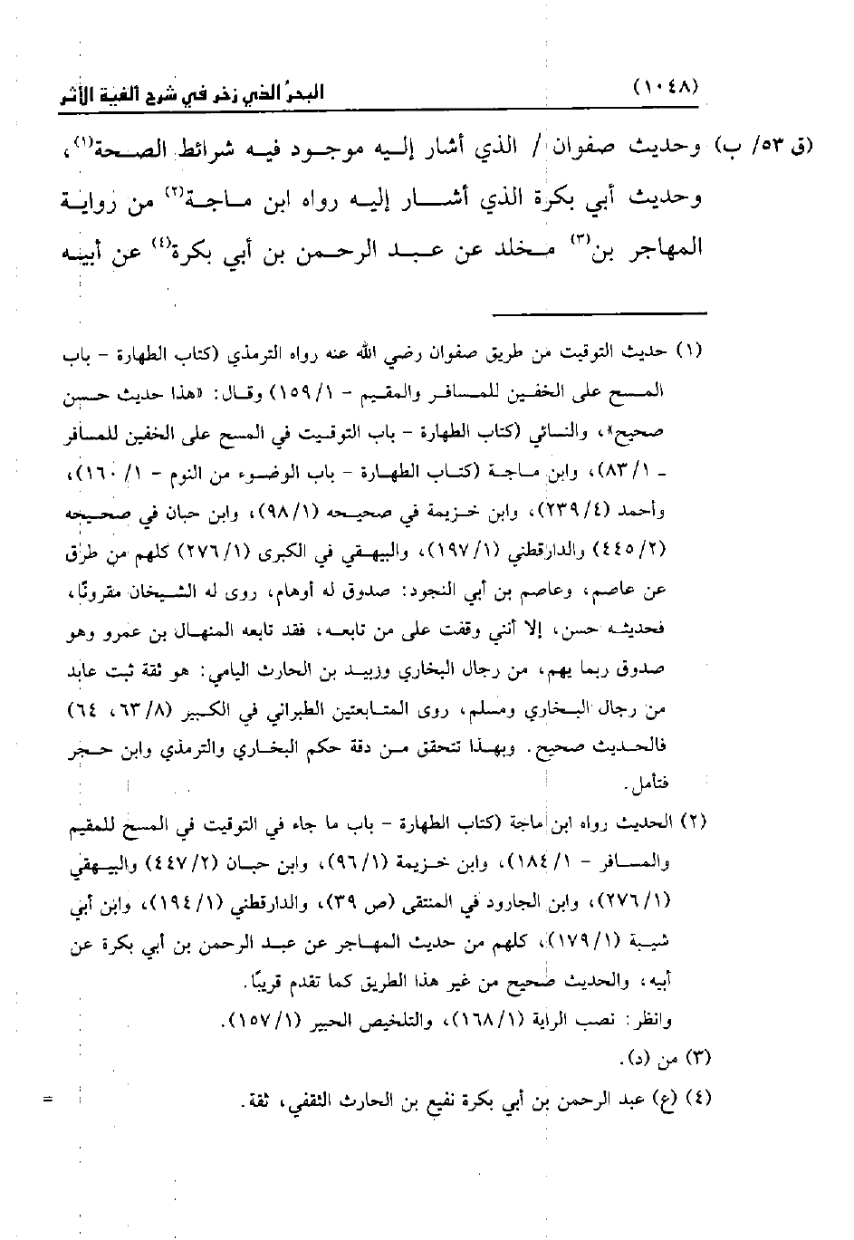(¬1) حديث التوقيت من طريق صفوان رضي اللَّه عنه رواه الترمذي (كتاب الطهارة - باب المسح على الخفين للمسافر والمقيم - 1/ 159) وقال: "هذا حديث حسن صحيح"، والنسائي (كتاب الطهارة - باب التوقيت في المسح على الخفين للمسافر - 1/ 83)، وابن ماجة (كتاب الطهارة - باب الوضوء من النوم - 1/ 160)، وأحمد (4/ 239)، وابن خزيمة في صحيحه (1/ 98)، وابن حبان في صحيحه (2/ 445) والدارقطني (1/ 197)، والبيهقي في الكبرى (1/ 276) كلهم من طرق عن عاصم، وعاصم بن أبي النجود: صدوق له أوهام، روى له الشيخان مقرونًا، فحديثه حسن، إلا أنني وقفت على من تابعه، فقد تابعه المنهال بن عمرو وهو صدوق ربما يهم، من رجال البخاري وزبيد بن الحارث اليامي: هو ثقة ثبت عابد من رجال البخاري ومسلم، روى المتابعتين الطبراني في الكبير (8/ 63، 64) فالحديث صحيح. وبهذا تتحقق من دقة حكم البخاري والترمذي وابن حجر فتأمل.
