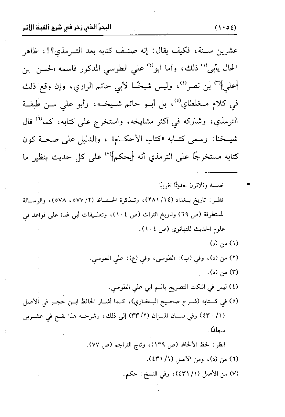 عشرين سنة، فكيف يقال: إنه صنف كتابه بعد الترمذي؟ ! ، ظاهر الحال يأبى (¬1) ذلك، وأما أبو (¬2) علي الطوسي المذكور فاسمه الحسن بن [علي] (¬3) بن نصر (¬4)، وليس شيخًا لأبي حاتم الرازي، وإن وقع ذلك في كلام مغلطاي (¬5)، بل أبو حاتم شيخه، وأبو علي من طبقة الترمذي، وشاركه في أكثر مشايخه، واستخرج على كتابه، كما (¬6) قال شيخنا: وسمى كتابه "كتاب الأحكام"، والدليل على صحة كون كتابه مستخرجًا على الترمذي أنه [يحكم] (¬7) على كل حديث بنظير ما