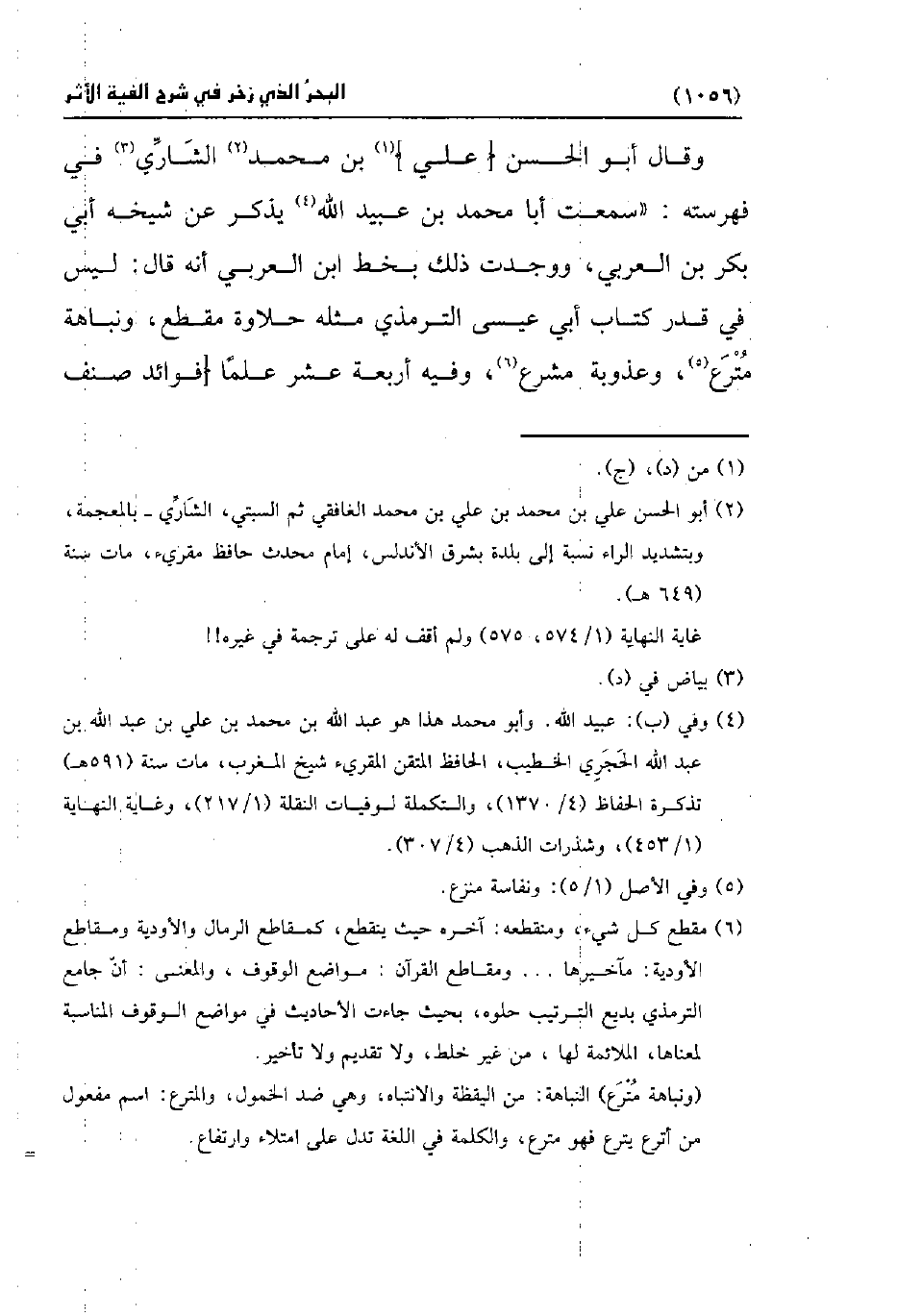 وقال أبو الحسن [علي] (¬1) بن محمد (¬2) الشَارِّي (¬3) في فهرسته: "سمعت أبي محمد بن عبيد اللَّه (¬4) يذكر عن شيخه أبي بكر بن العربي، ووجدت ذلك بخط ابن العربي أنه قال: ليس في قدر كتاب أبي عيسى الترمذي مثله حلاوة مقطع، ونباهة مُتْرَع (¬5)، وعذوبة مشرع (¬6)، وفيه أربعة عشر علمًا [فوائد صنف