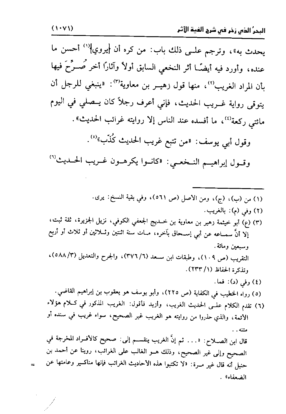 يحدث به"، وترجم على ذلك باب: من كره أن [يروي] (¬1) أحسن ما عنده، وأورد يه أيضًا أثر النخعي السابق أولًا وآثارًا أخر صُرِّحَ فيها بأن المراد الغريب (¬2)، منها قول زهير بن معاوية (¬3): "ينبغي للرجل ان يتوقى رواية غريب الحديث، فإني أعرف رجلًا كان يصلي في اليوم مائتي ركعة (¬4)، ما أفسده عند الناس إلا روايته غرائب الحديث".
