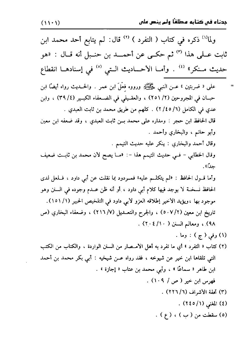 ولما (¬1) ذكره في كتاب (التفرد) (¬2) قال: لم يتابع أحد محمد ابن ثابت على هذا (¬3) ثم حكى عن أحمد بن حنبل أنه قال: "هو حديث منكر" (¬4). واما الأحاديث التي (¬5) في إسنادها انقطاع