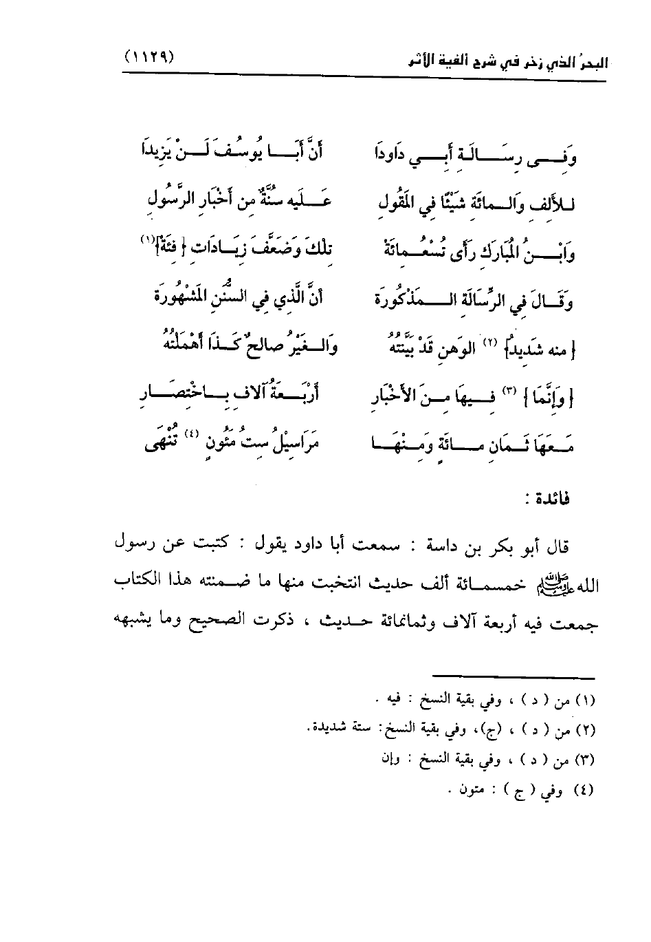 قال أبو بكر بن داسة: سمعت أبا داود يقول: كتبت عن رسول اللَّه -صلى اللَّه عليه وسلم- خمسمائة ألف حديث انتخبت منها ما ضمنته هذا الكتاب جمعت فيه أربعة آلاف وثمانمائة حديث، ذكرت الصحيح وما يشبهه