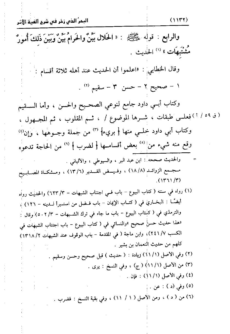 (¬1) رواه في سننه (كتاب البيوع - باب في اجتناب الشبهات - 3/ 623)، والحديث رواه أيضًا: البخاري في (كتاب الإيمان - بان فضل من استبرأ لدينه - 126)، والترمذي في (كتاب البيوع - باب ما جاء في ترك الشبهات - 3/ 502) وقال: "هذا حديث حسن صحيح" والنسائي في (كتاب البيوع - باب اجتناب الشبهات في الكسب 7/ 241)، وابن ماجة (في المقدمة - باب الوقوف عند الشبهات 2/ 1318) كلهم من حديث النعمان بن بشير.