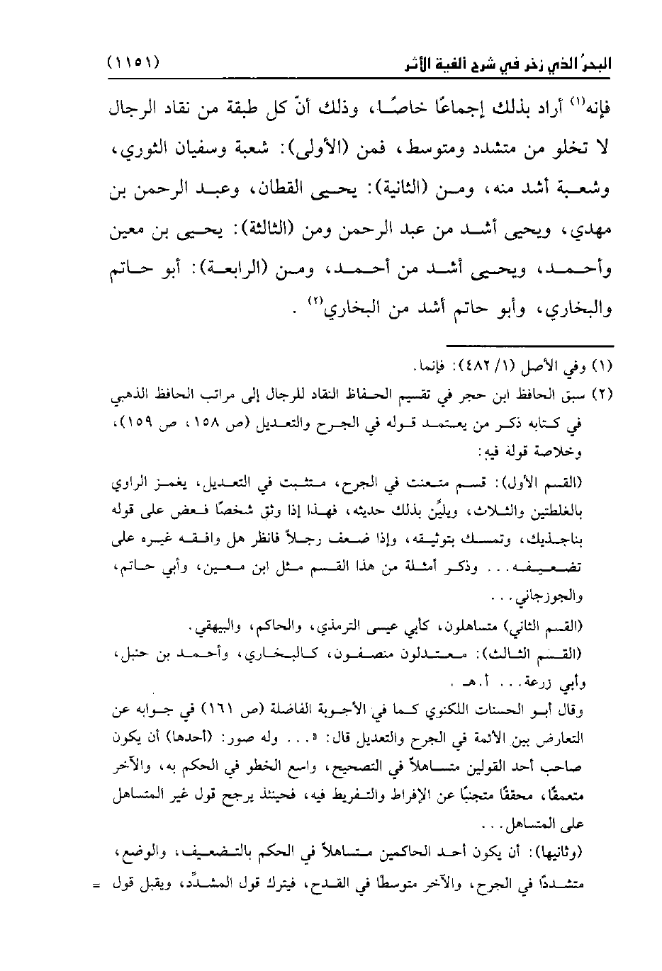 (¬2) سبق الحافظ ابن حجر في تقسيم الحفاظ النقاد للرجال إلى مراتب الحافظ الذهبي في كتابه ذكر من يعتمد قوله في الجرح والتعديل (ص 158، ص 159)، وخلاصة قوله فيه: