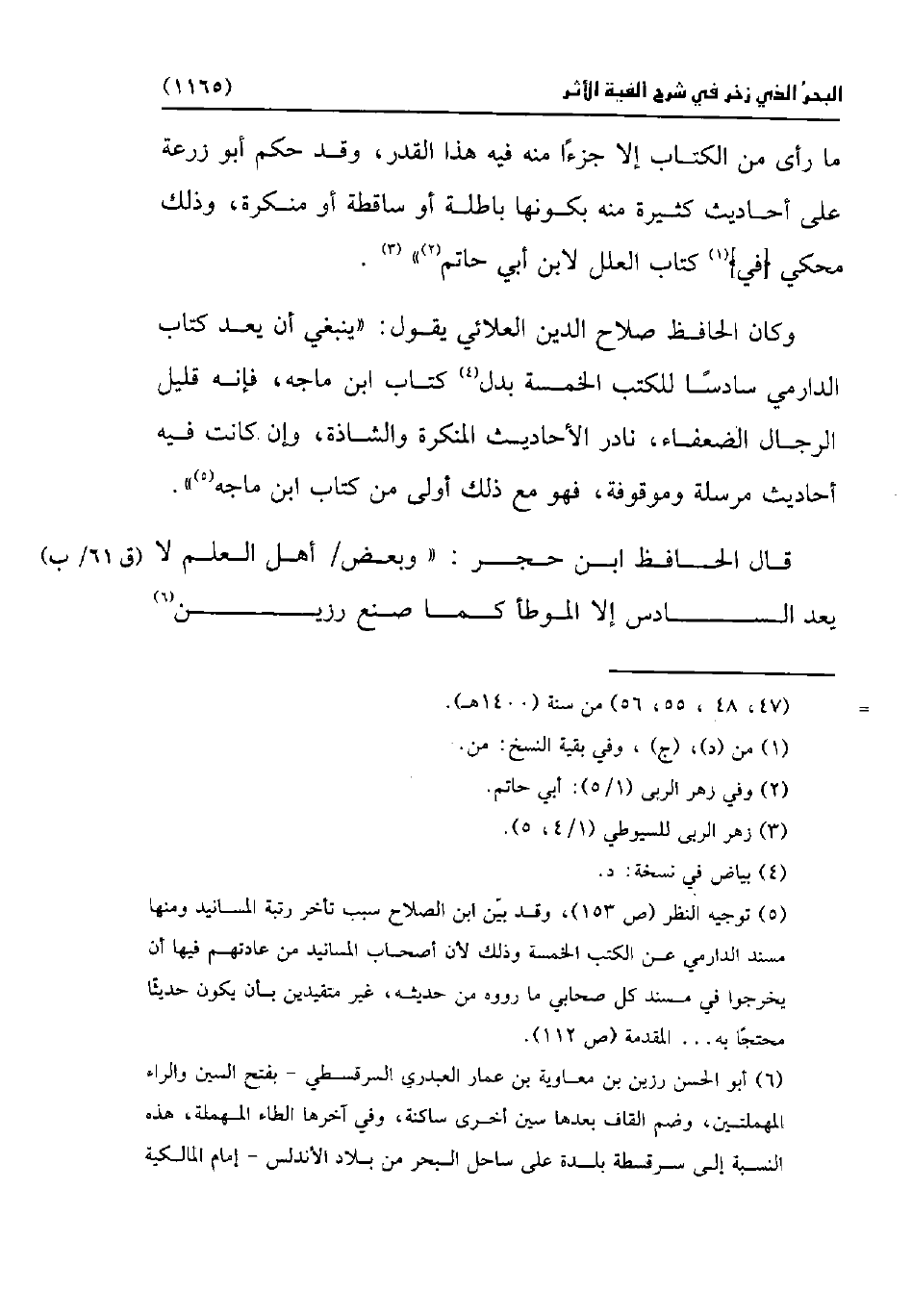 وكان الحافظ صلاح الدين العلائي يقول: "ينبغي أن يعد كتاب الدارمي سادسًا للكتب الخمسة بدل (¬4) كتاب ابن ماجه، فإنه قليل الرجال الضعفاء، نادر الأحاديث المنكرة والشاذة، وإن كانت فيه أحاديث مرسلة وموقوفة، فهو مع ذلك أولى من كتاب ابن ماجه (¬5) ".