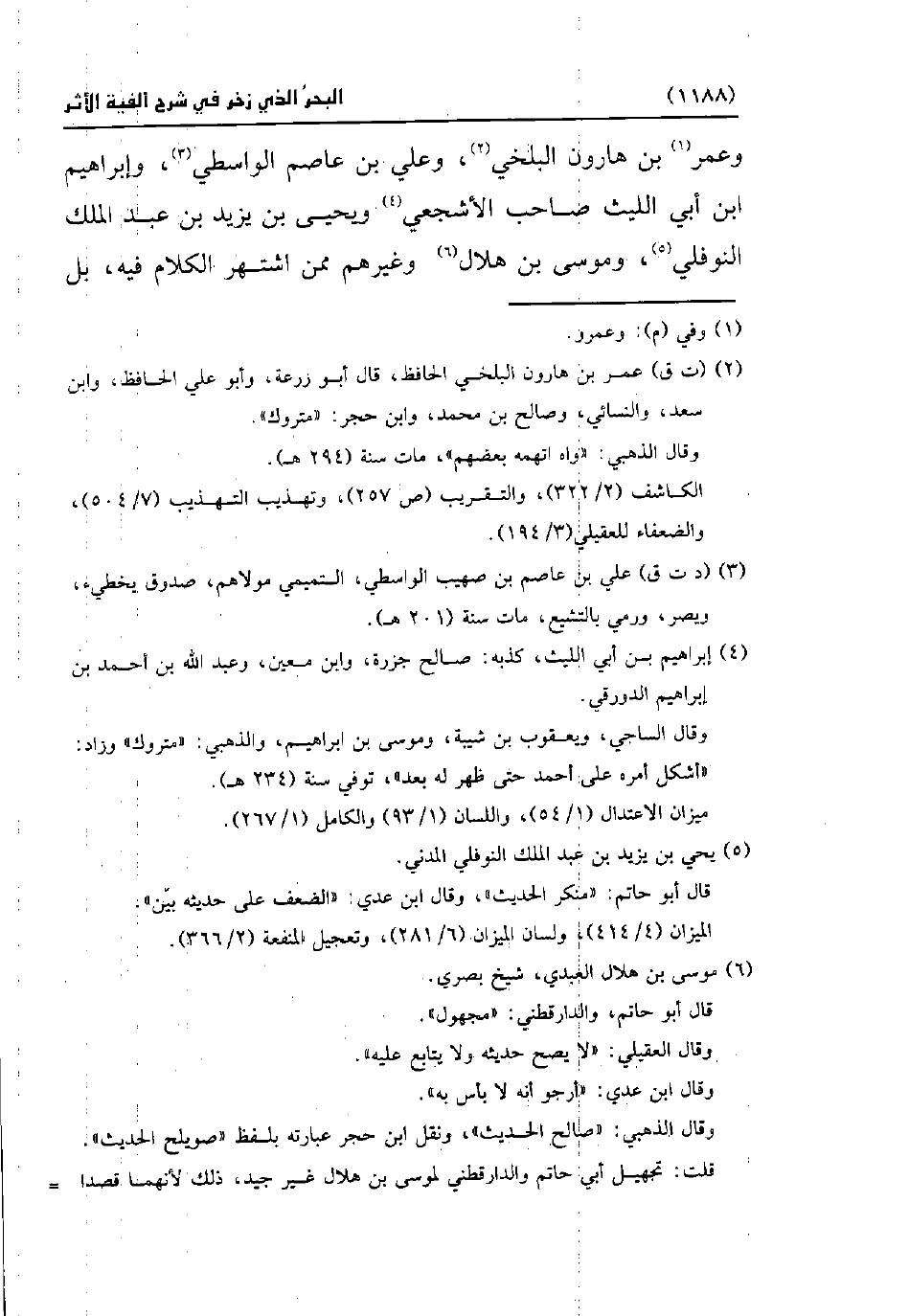 وعمر (¬1) بن هارون البلخي (¬2)، وعلي بن عاصم الواسطي (¬3)، وإبراهيم ابن أبي الليث صاحب الأشجعي (¬4) ويحيى بن يزيد بن عبد الملك النوفلي (¬5)، وموسى بن هلال (¬6) وغيرهم ممن اشتهر الكلام فيه، بل